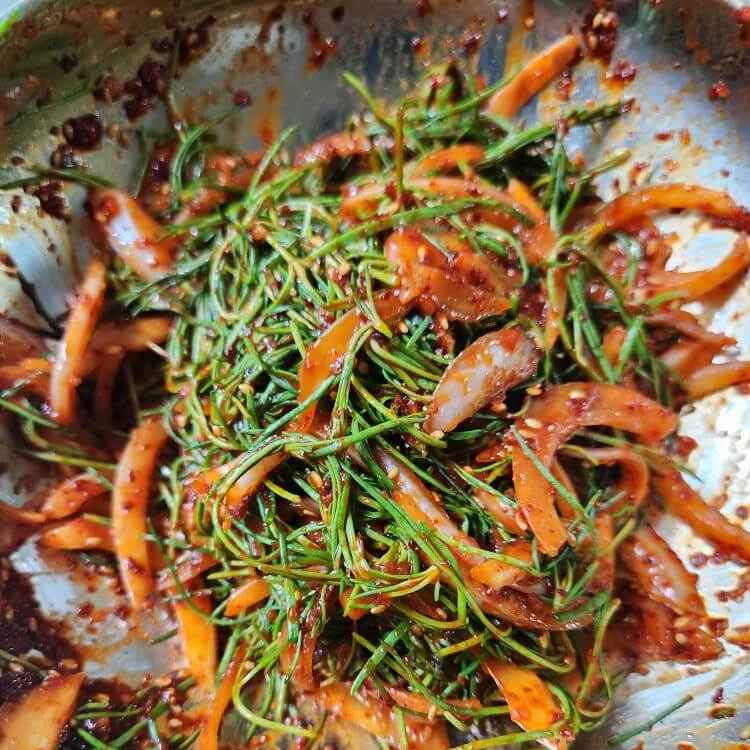 📌새발나물 겉절이는 숟가락 기준으로 매실액 1, 식초 0.5, 홍게액 3, 고춧가루 2, 설탕 1, 다진마늘 0.5, 들기름 1를 넣고 잘 섞어주면 일차적으로 완성이다.
