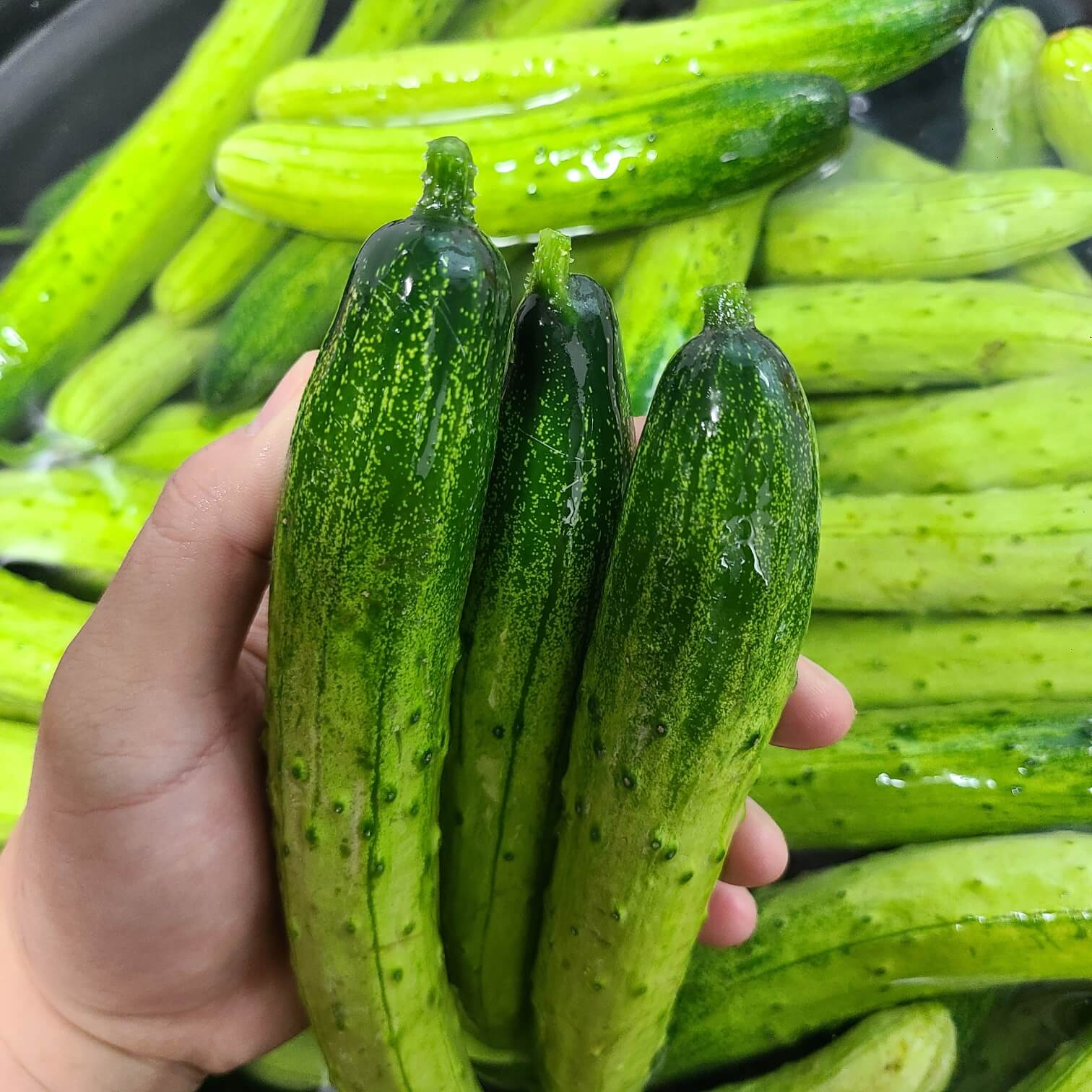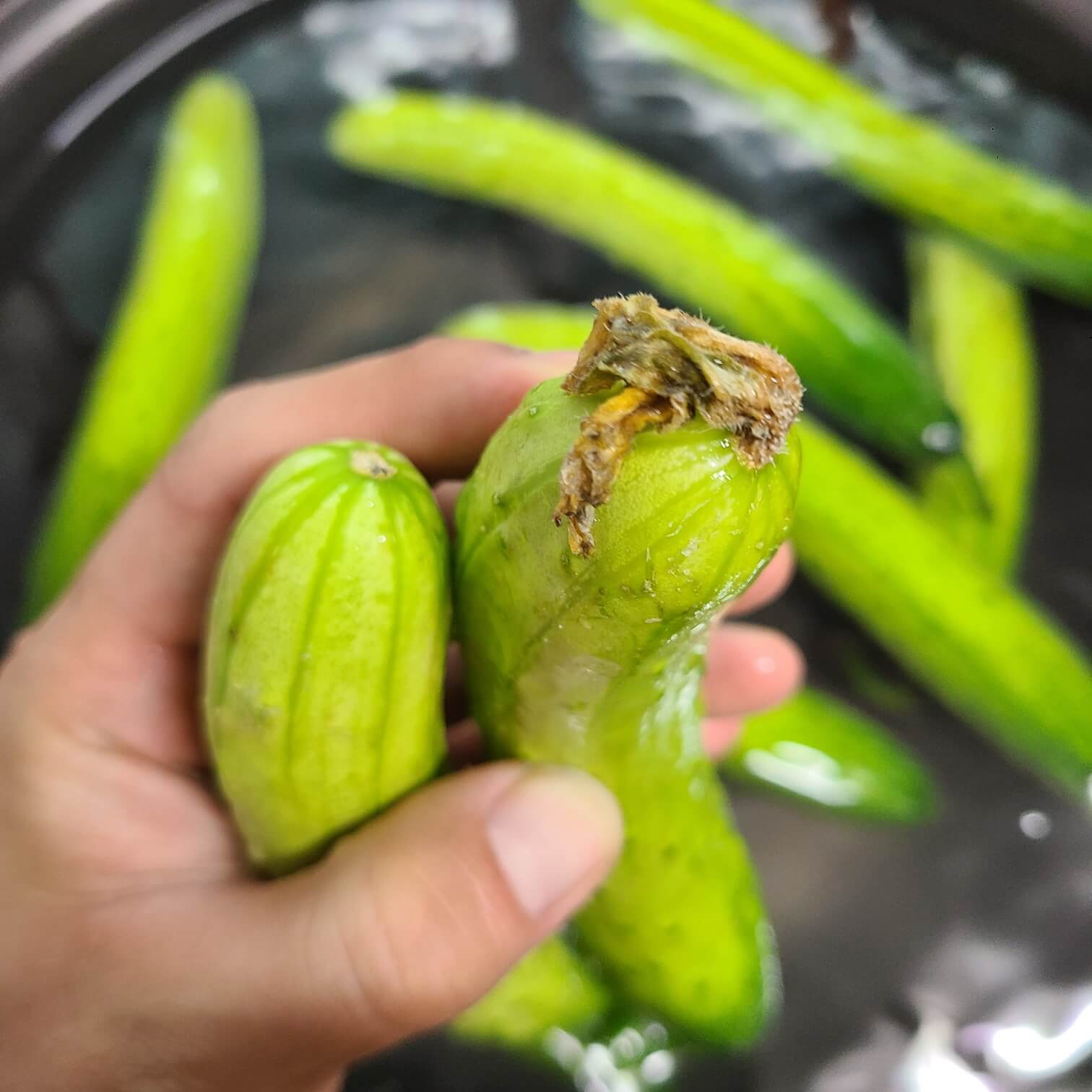✅ 이 때 오이의 꽃잎은 제거하고, 꼭지 부분을 짤막하게 위 사진처럼 잘라주는 것이 중요하다.