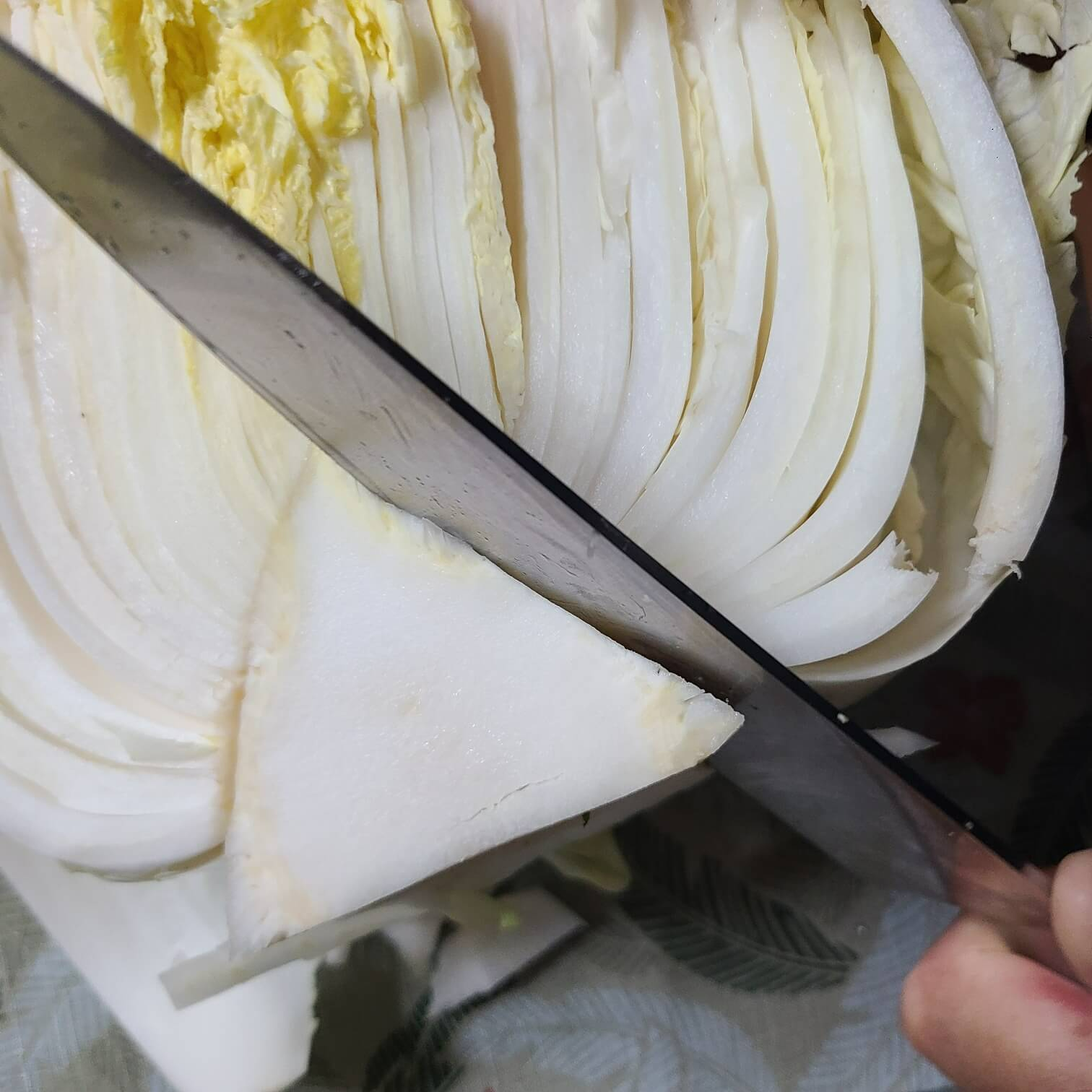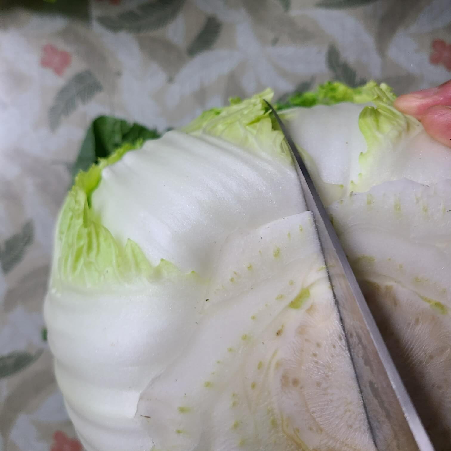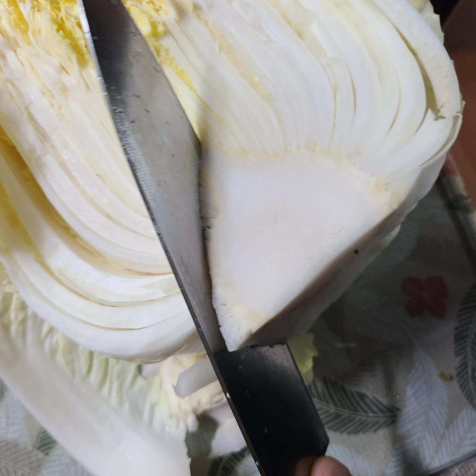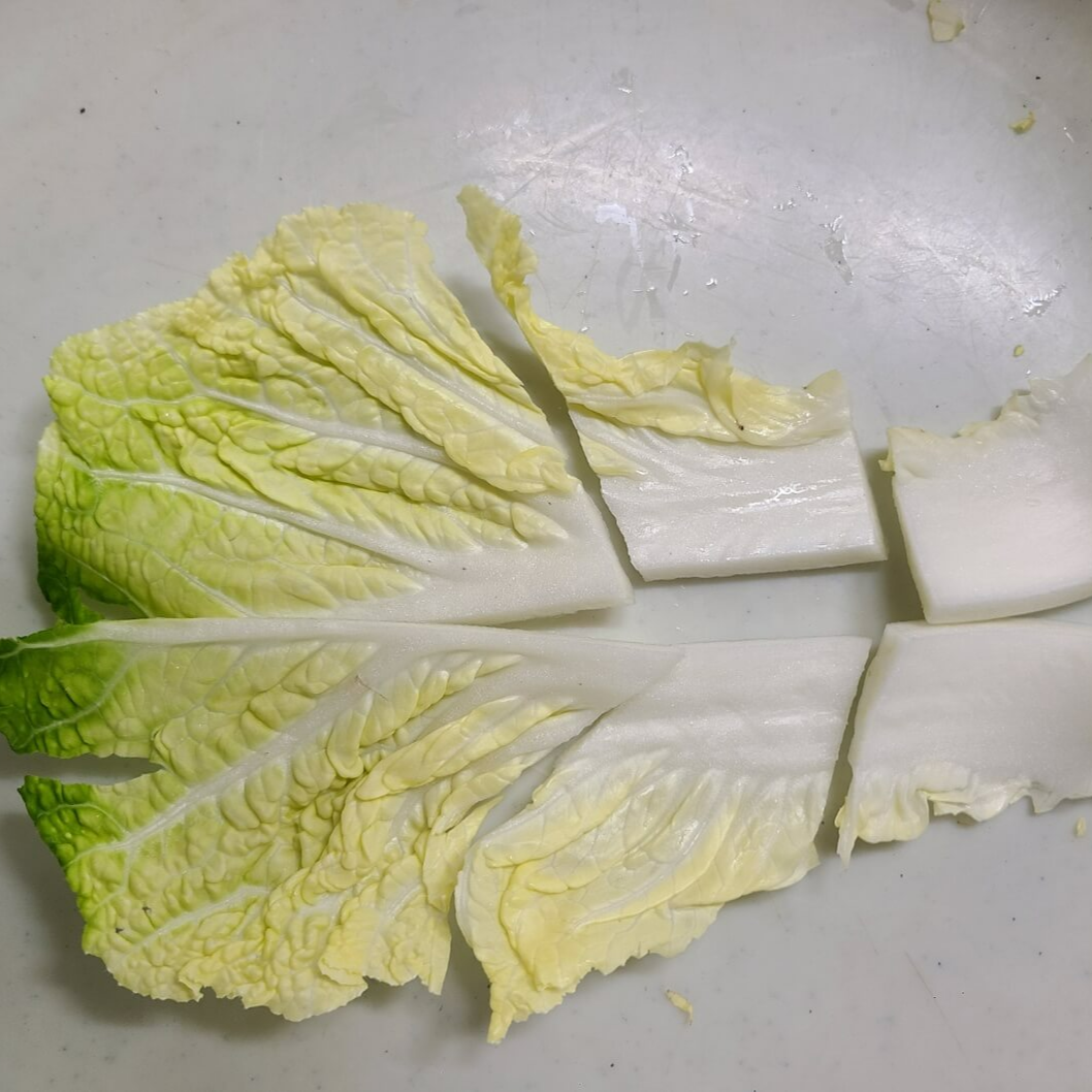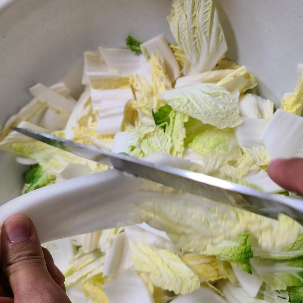 2. 배추는 왼쪽사진처럼 칼로 손질해주면 되지만, 실제로는 배추를 칼로 먹기 좋은 크기로 잘라준다고 보면 된다.
