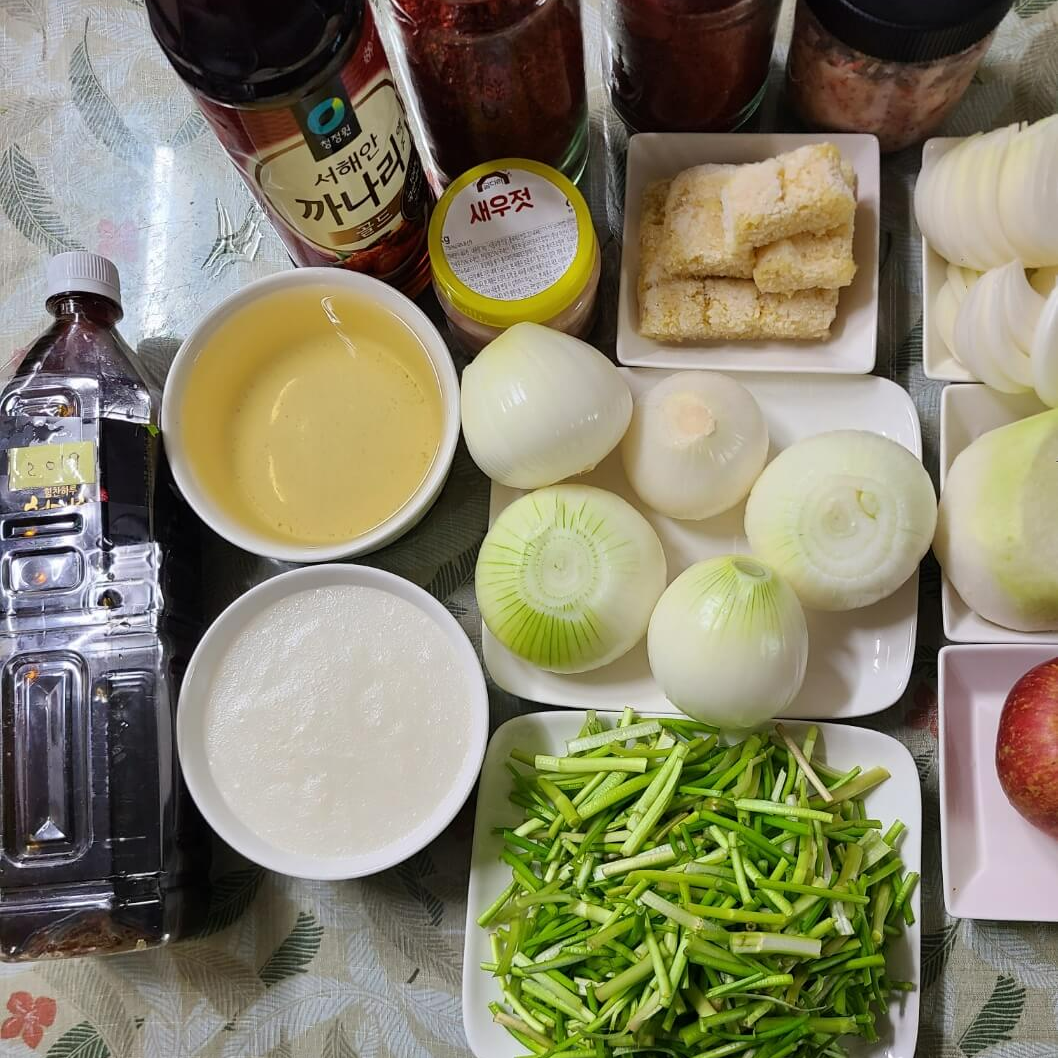 - 배추 1망(배추3개), 천일염 1,500g, 무 반개 270g, 양파 5개 945g, 사과 1개 227g, 미나리 1팩 170g, 다진마늘 2032g (숟가락 기준으로 1 = 20~ 26g), 멸치다시마육수 300ml, 찹쌀풀 250ml