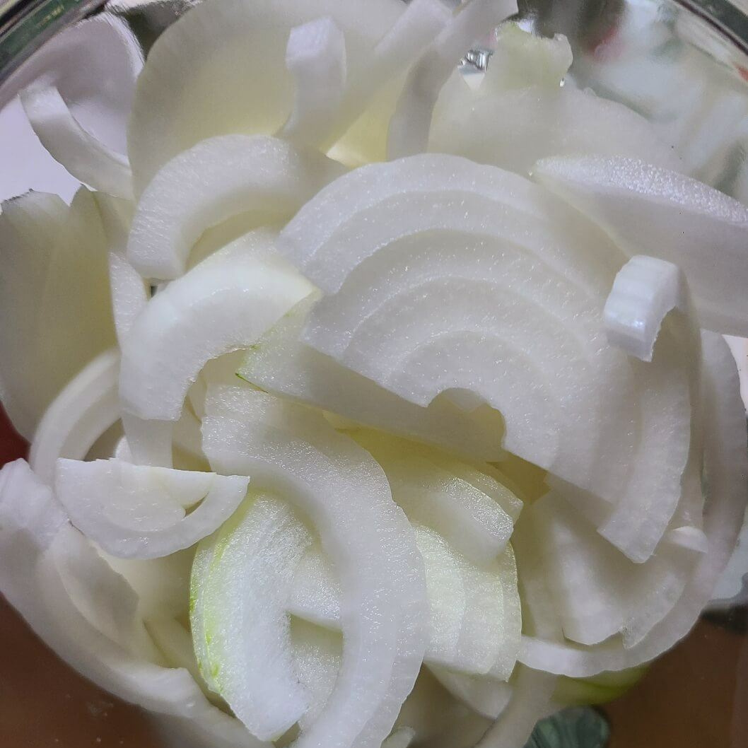 ✅양파 5개 (945g), 사과 1개(227g), 무 반개 (270g)을 모두 믹서기로 갈아주면 되는데, 이때 수분이 없어서 곱게 믹서기로 갈지 못하면 멸치 다시마 육수나 찹쌀풀을 넣고 갈아주면 된다.