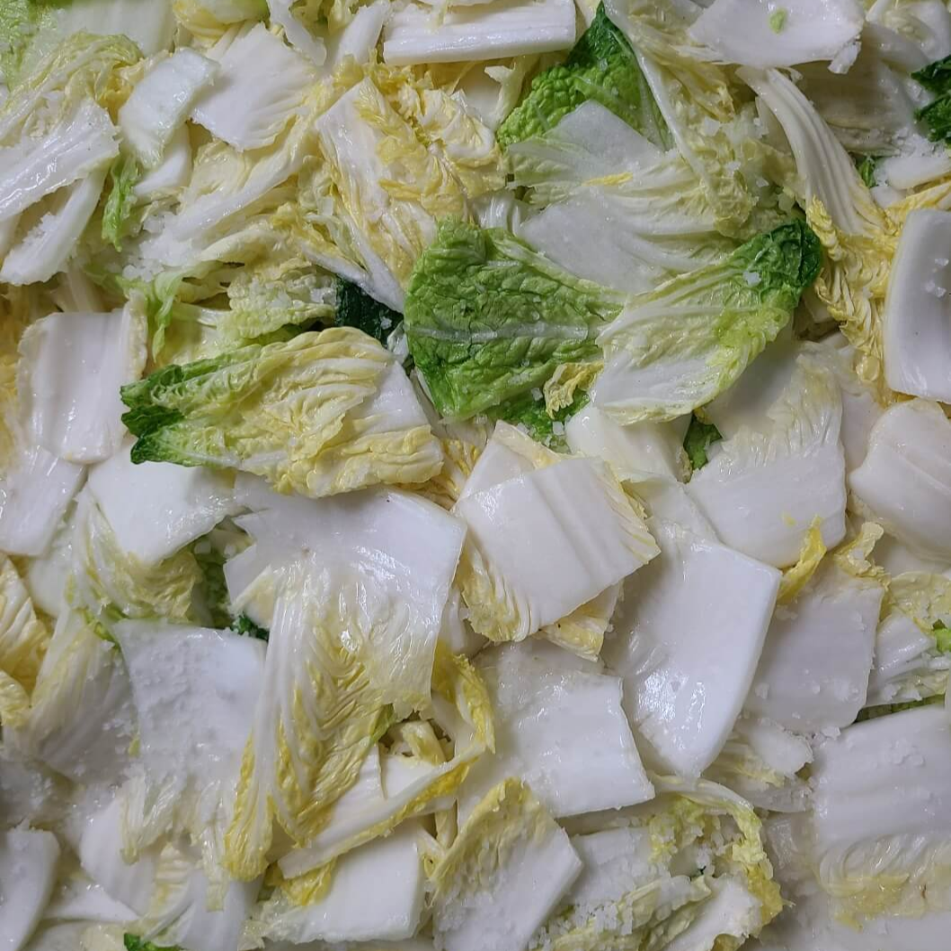 ✅이때 뿌리는 천일염 사용량은 1,000g으로 3시간동안 절이고 찬물에 2 번 ~ 3번정도 헹구고나서 채반으로 물기를 제거해 주면 된다.