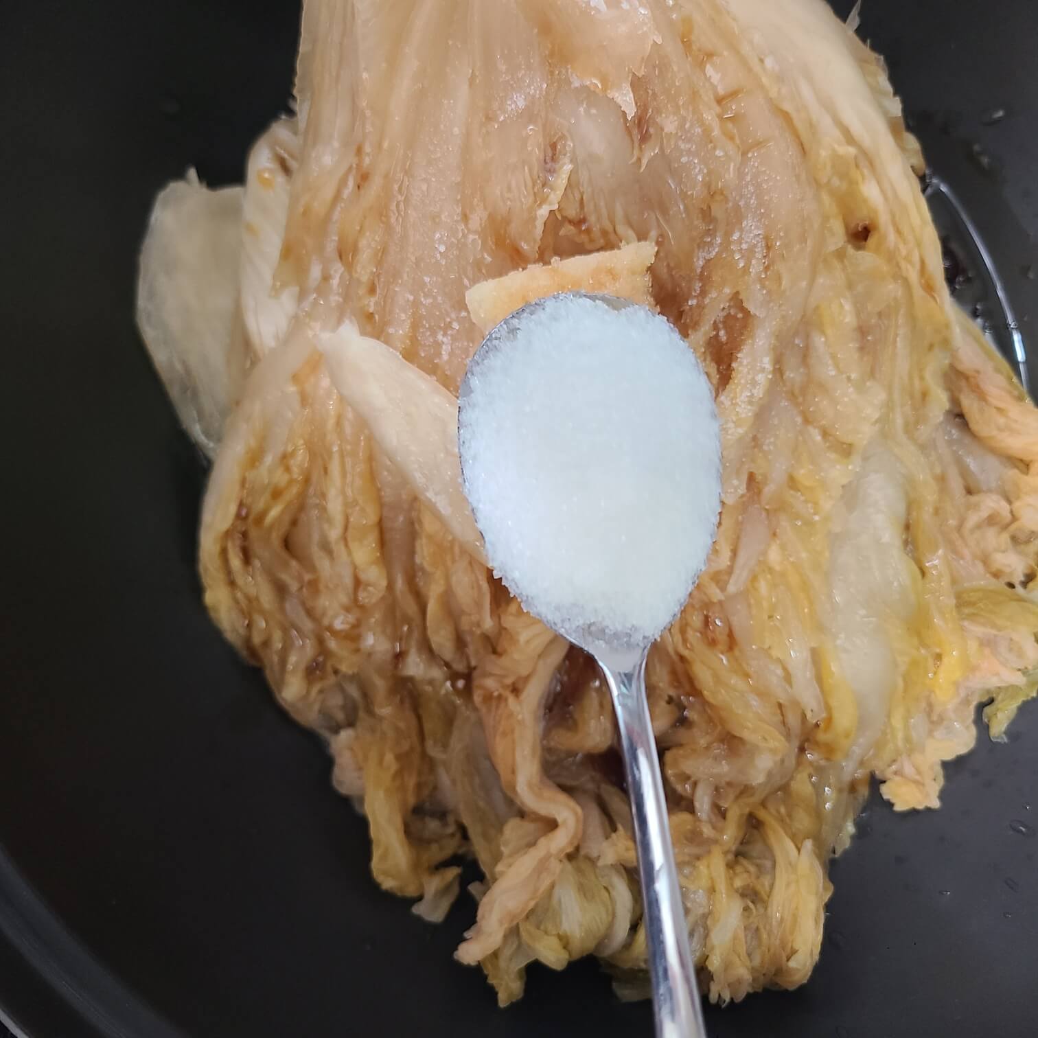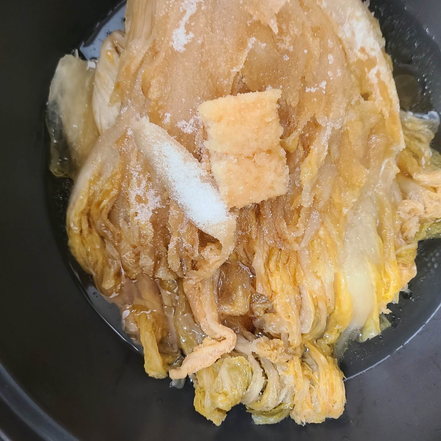 ✅설탕 식초를 녹인 물에 묵은지를 넣고 조물닥 거리면서 40분간 담궈둔다.