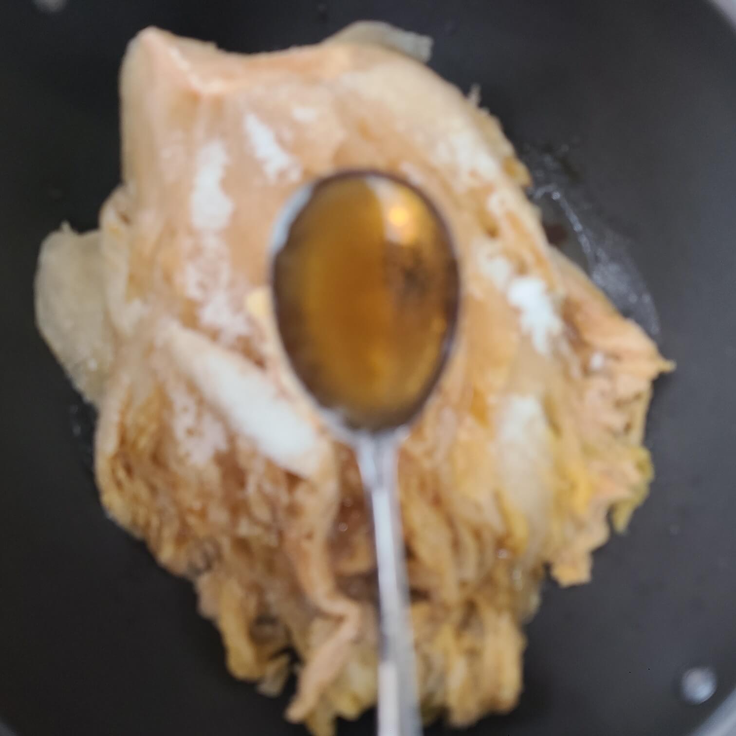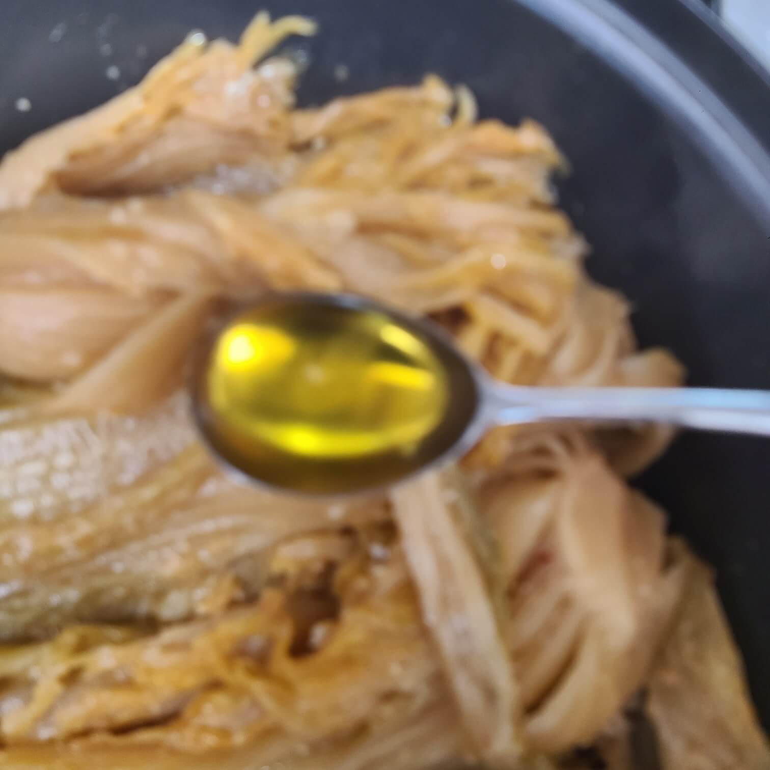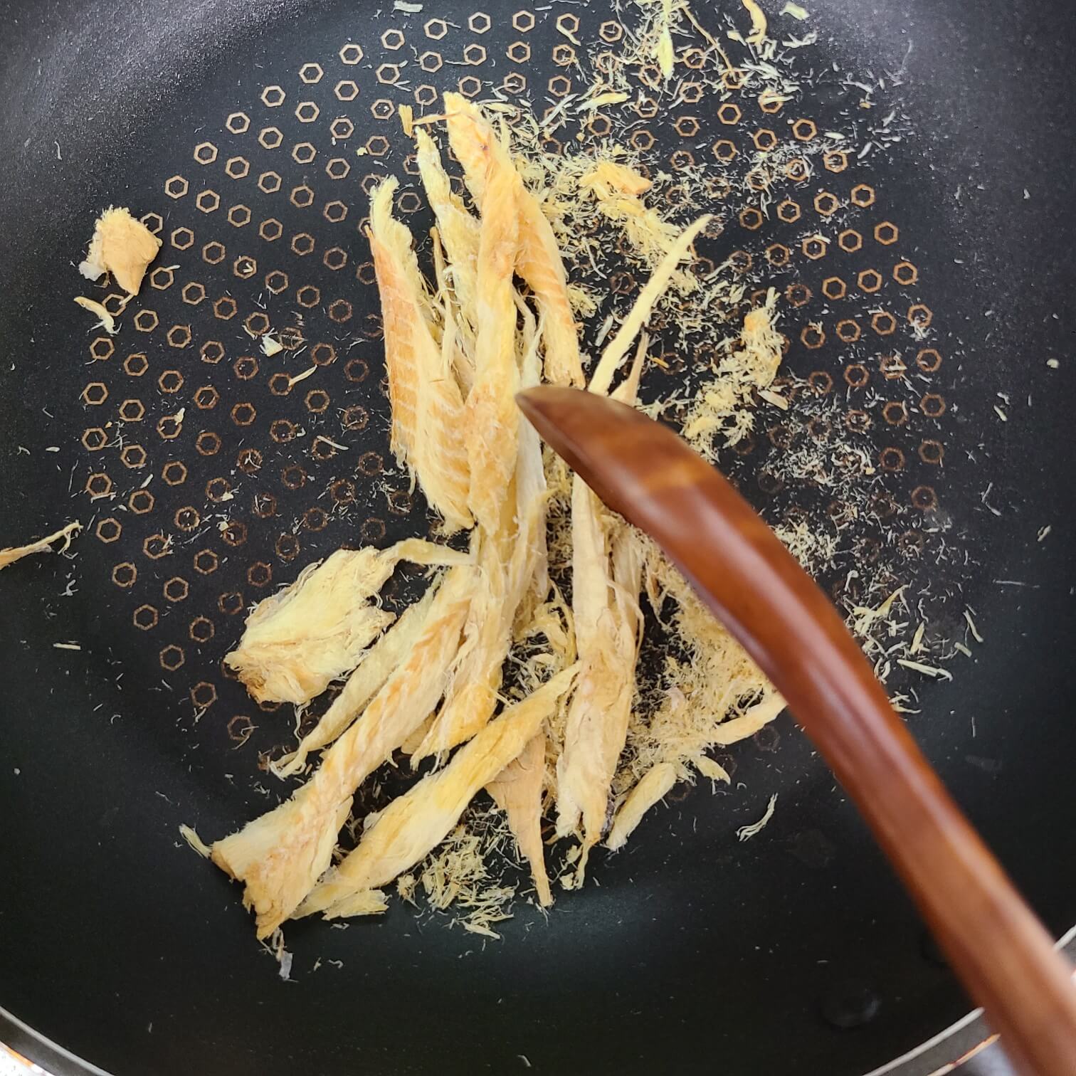 2. 오늘 요리의 핵심 바로 황태채이다. 황태채 10g을 넣고 약불로 볶아주면 된다.
