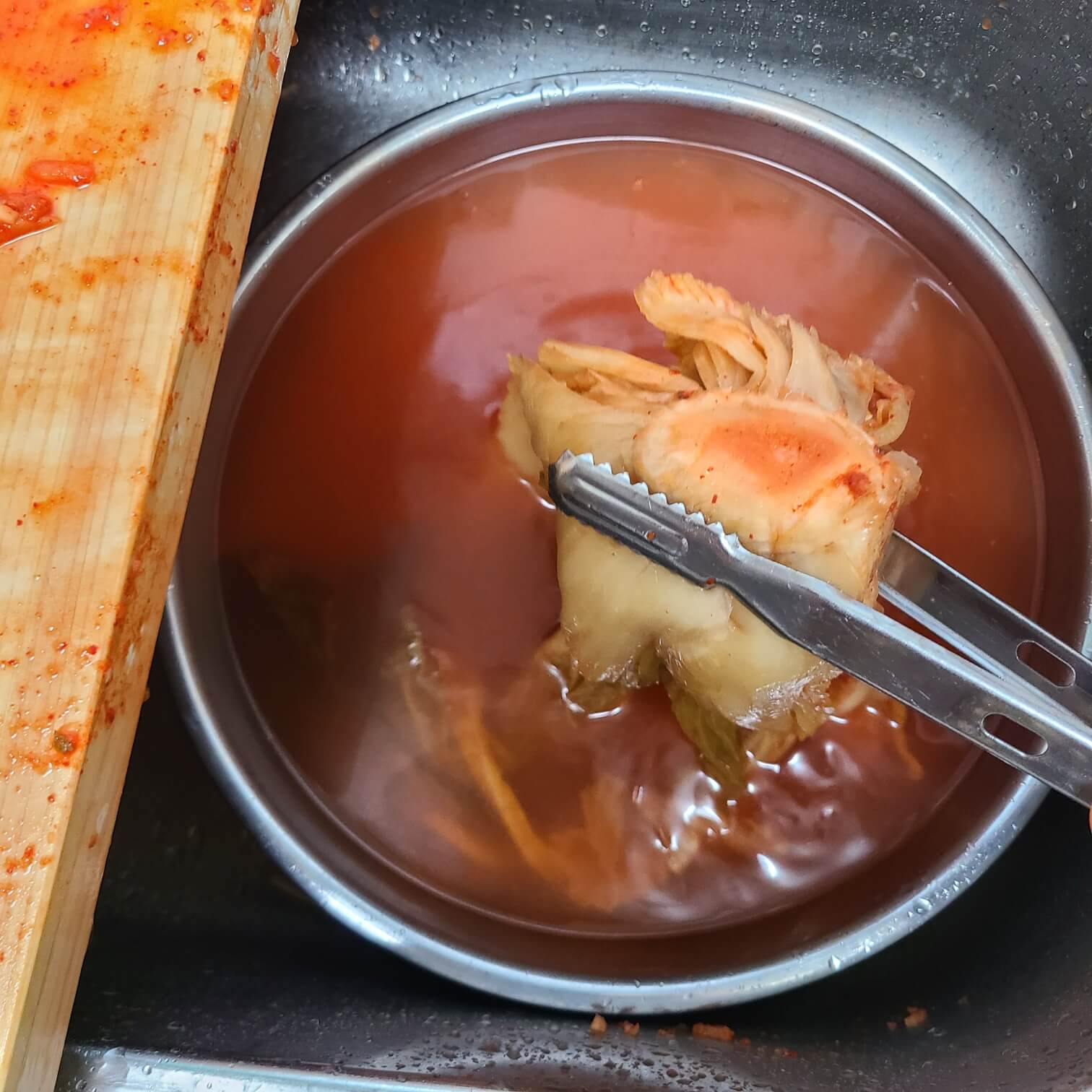 ✅배추김치를 물에 한번 씻은 다음 볼에 숟가락 기준으로 물3, 식초 2, 설탕 2를 넣어 녹을 때 까지 저어준다.