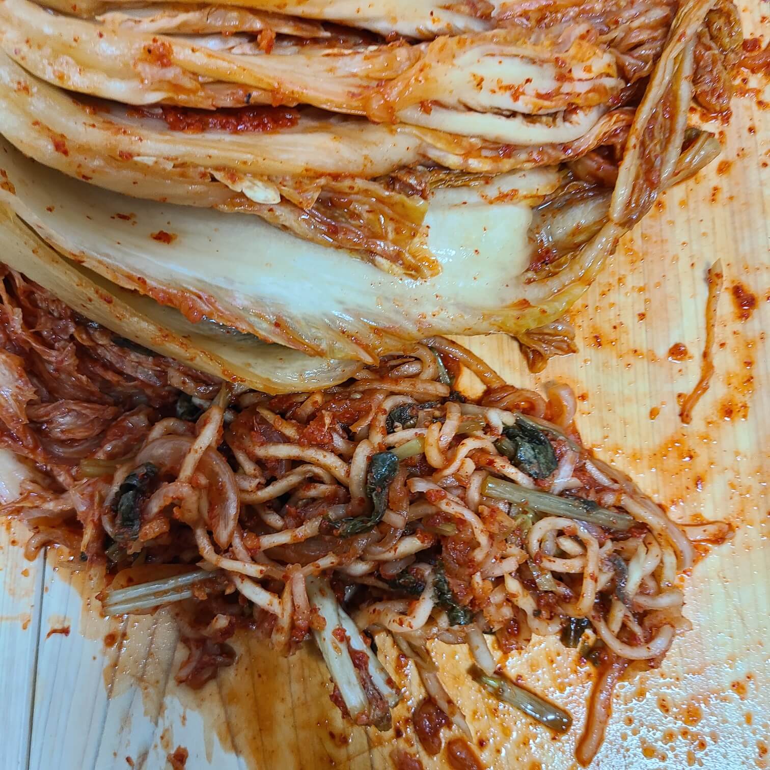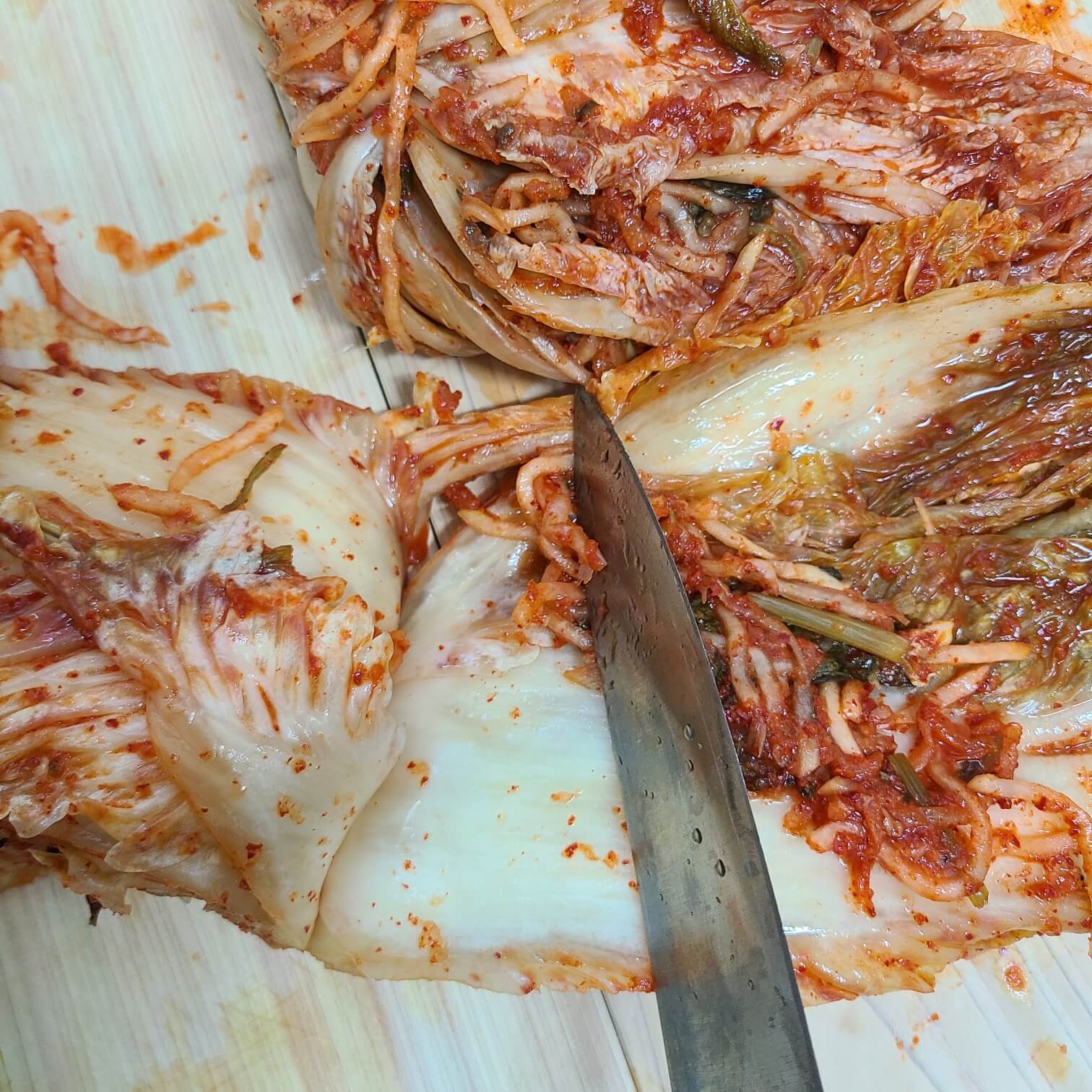 1. 배추김치의 속에 있는 속재료들을 모두 칼로 걷어서 깨끗하게 만들어준다.