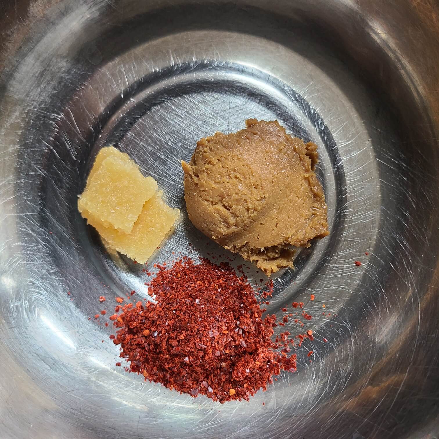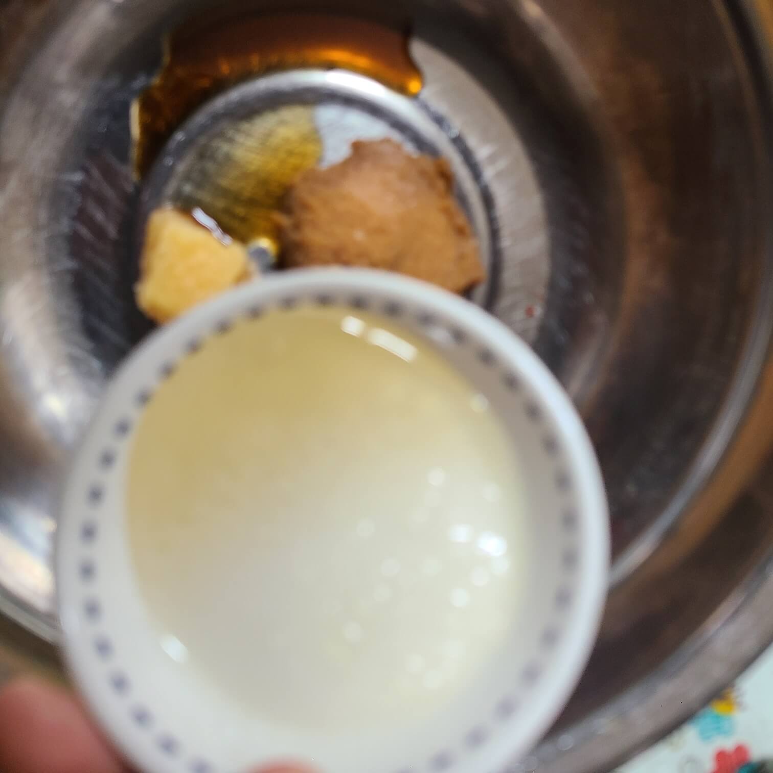 - 숟가락 기준으로 된장 1, 진간장 1, 고춧가루 1, 참기름 1, 꿀 2, 통깨 1, 천일염 1