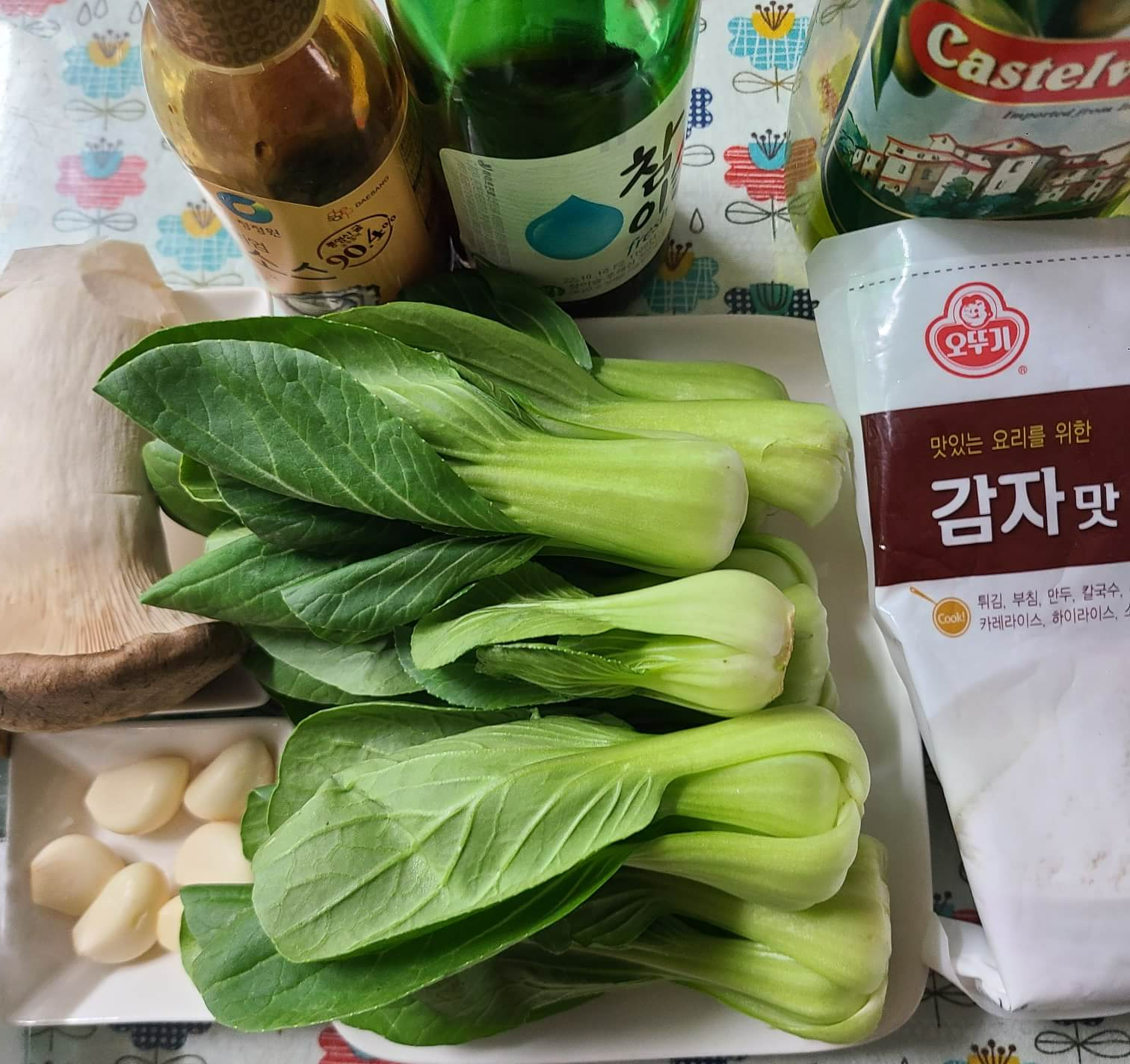- 청경채 1팩, 새송이 버섯 2개, 통마늘 6알, 올리브유, 굴소스, 소금, 감자전분, 물, 참기름 취향 것, 천일염
