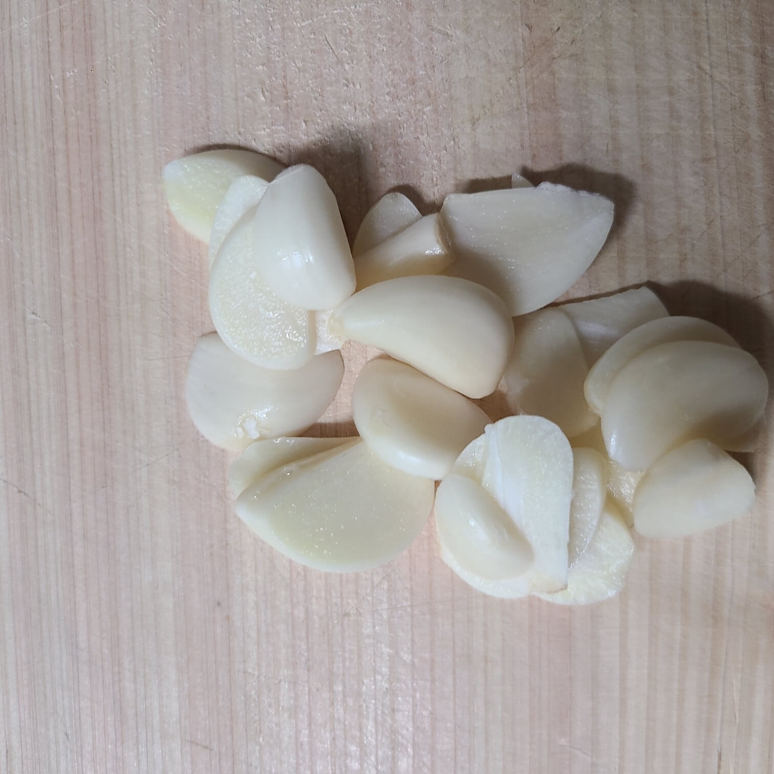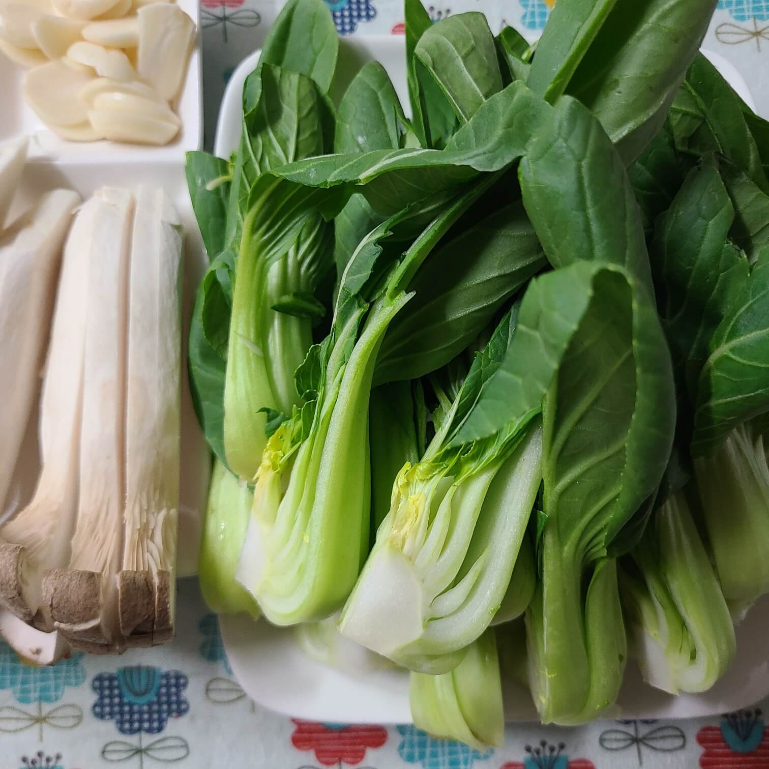 1. 새송이는 반으로 자르고나서 길게 썰고, 통마늘은 편썰기, 청경채는 4등분으로 썰어주면 된다.