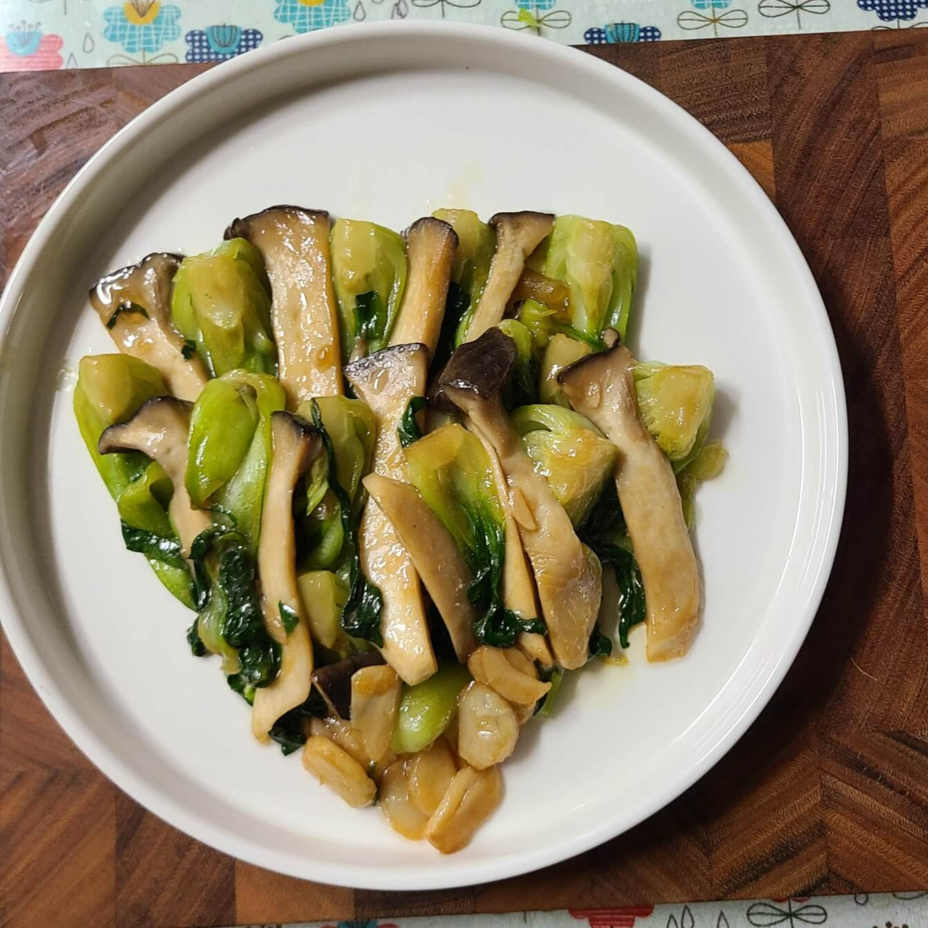 ✅편마늘이 갈색으로 바뀌기 시작하면 청경채, 새송이버섯, 소금 3꼬집을 넣어준다.