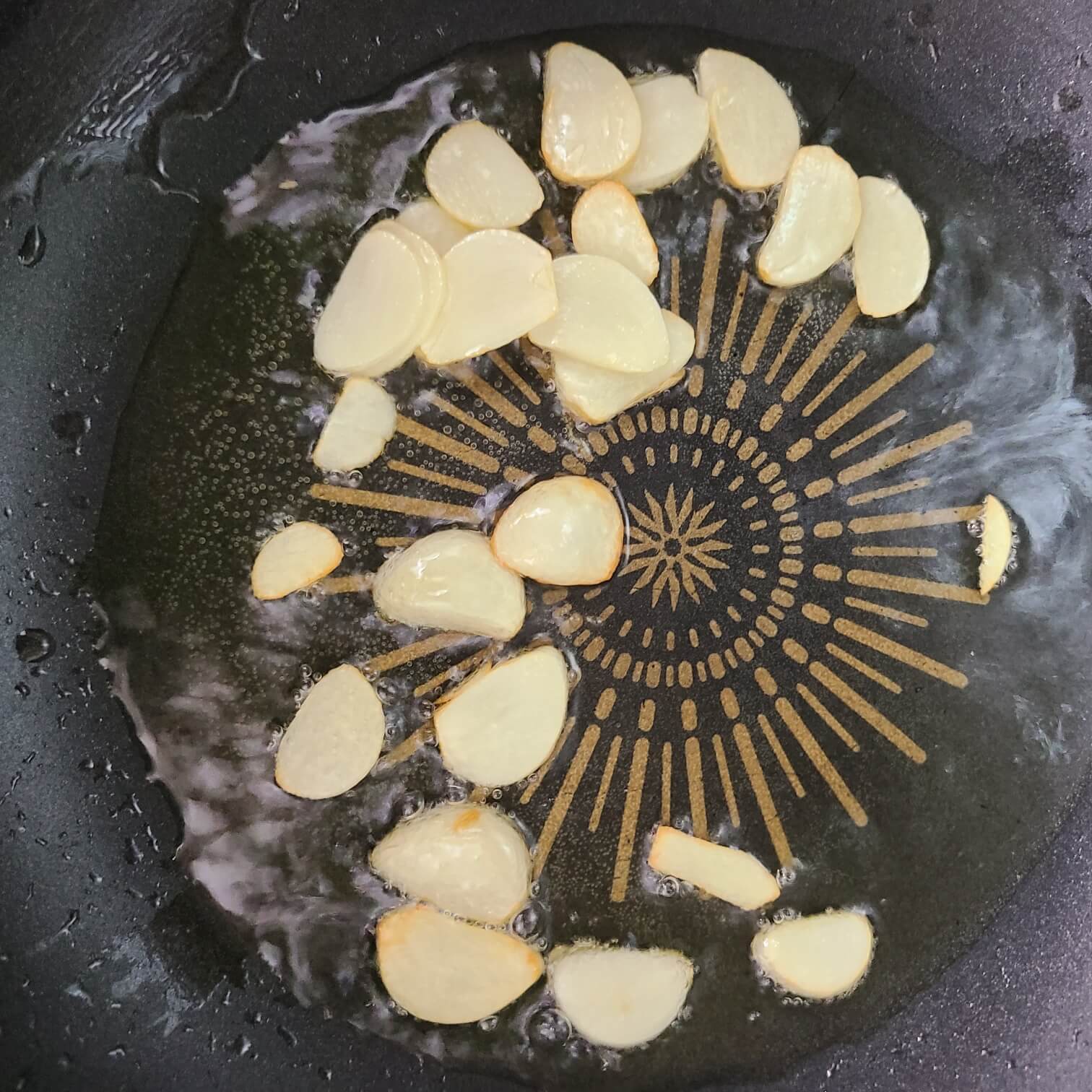 4. 숟가락 기준으로 올리브유 5 을 넣고 편썰은 마늘을 넣고 중간불로 볶아주면 된다.