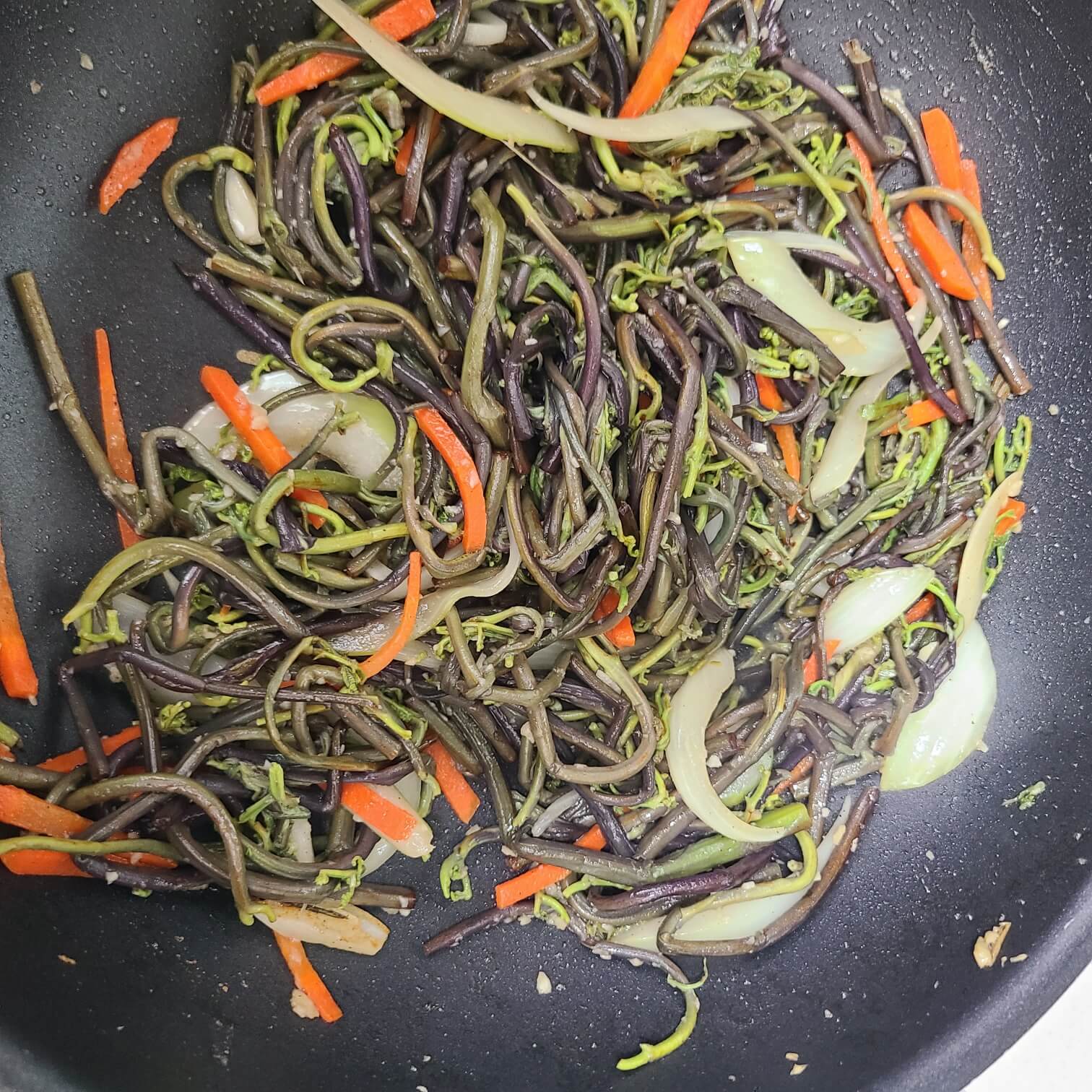 2. 숟가락 기준으로 간장 2, 들기름 2, 홍게액젓 2, 다진마늘과 손질한 양파, 당근을 넣고 볶아주면 된다.