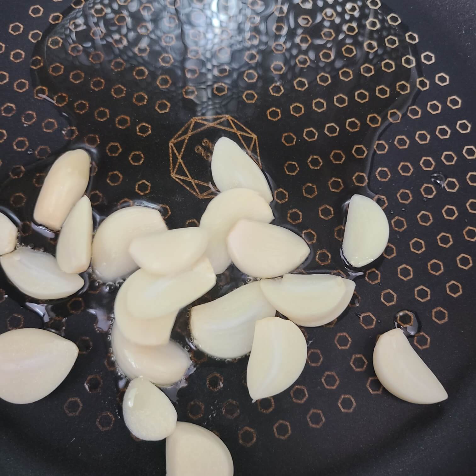 1. 숟가락 기준으로 올리브유 5를 넣고 달군 다음에 편마늘을 넣고 중간불로 볶아주면 된다.