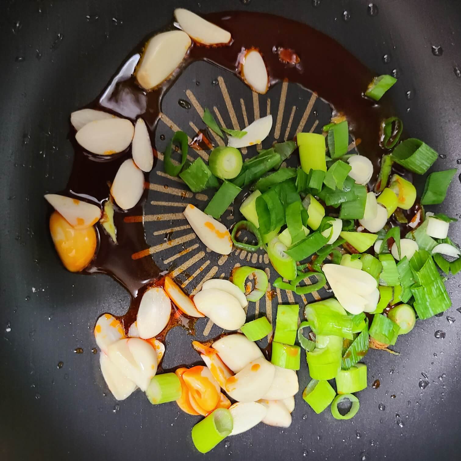 1. 숟가락 기준으로 고추기름 3을 넣고 손질한 대파, 편마늘을 볶아주면 된다.
