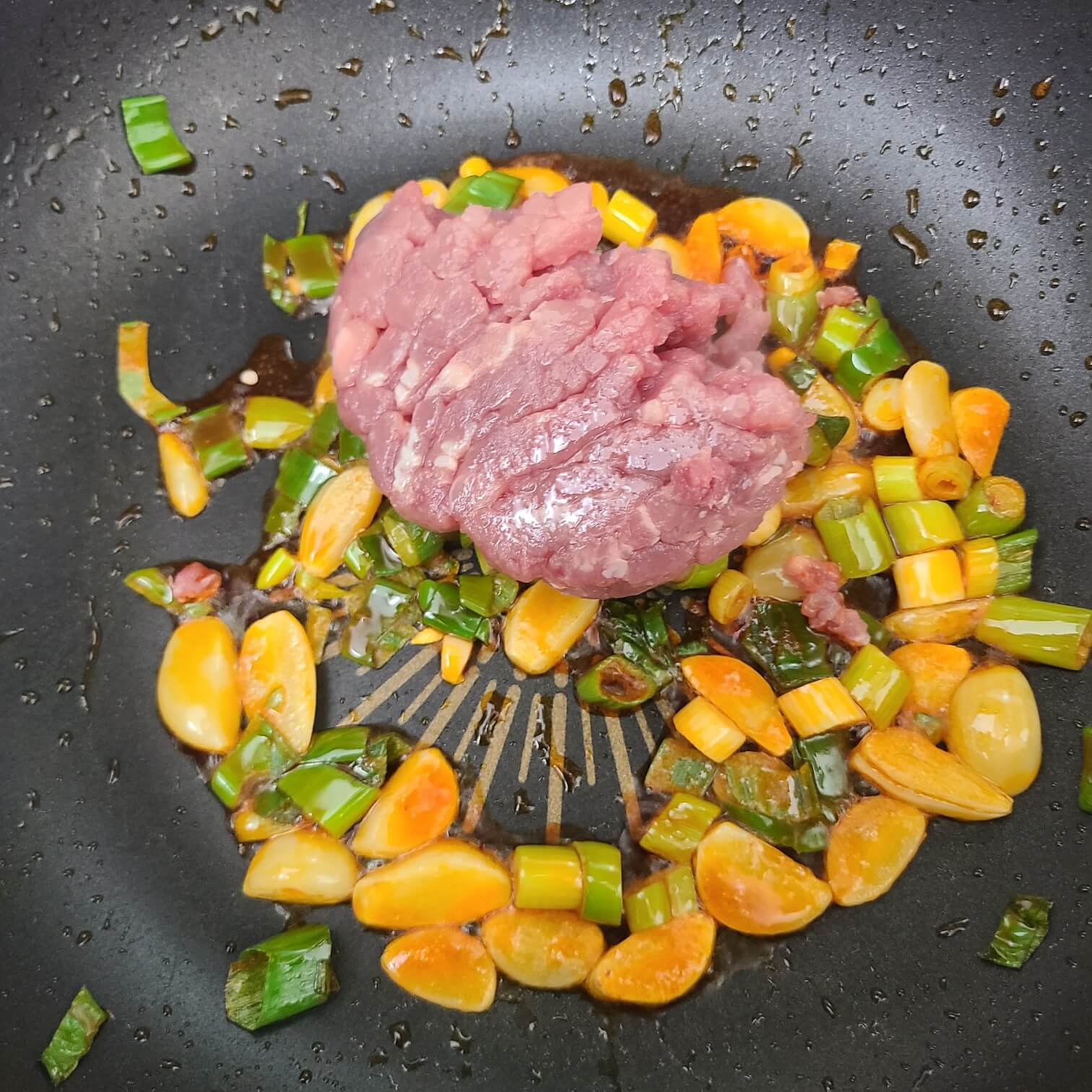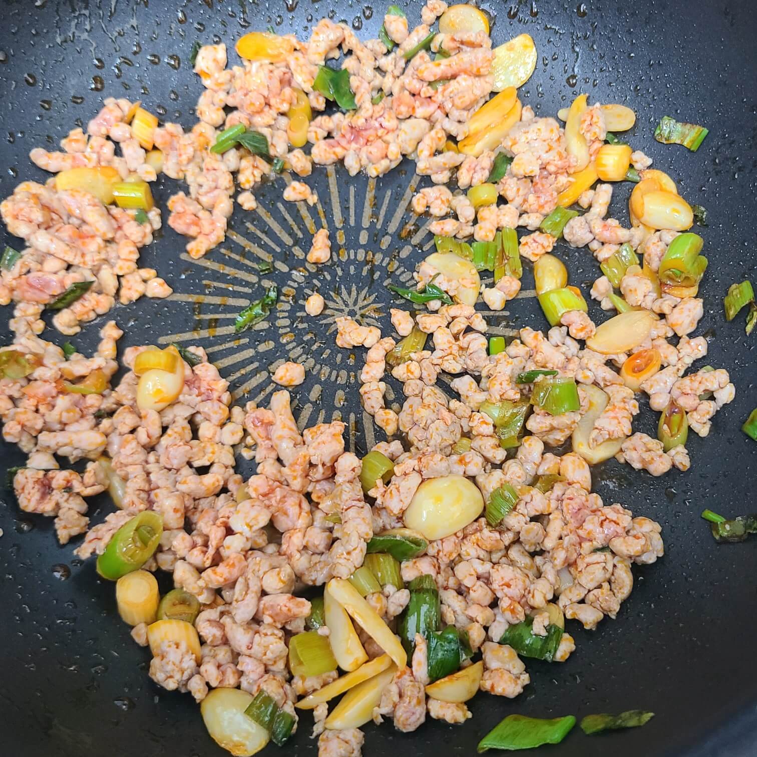 2.마늘 끝이 갈색으로 변할 때 쯤 다짐육을 넣고 볶아주면 된다.