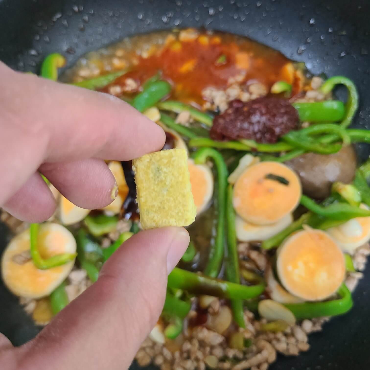 - 가지 3개, 돼지고기 다짐육, 피망 2개, 치킨스톡 1/2개, 새송이 버섯 1개, 대파뿌리 1개, 맛술, 생수, 두반장, 굴소스, 설탕, 전분, 고추기름, 편마늘