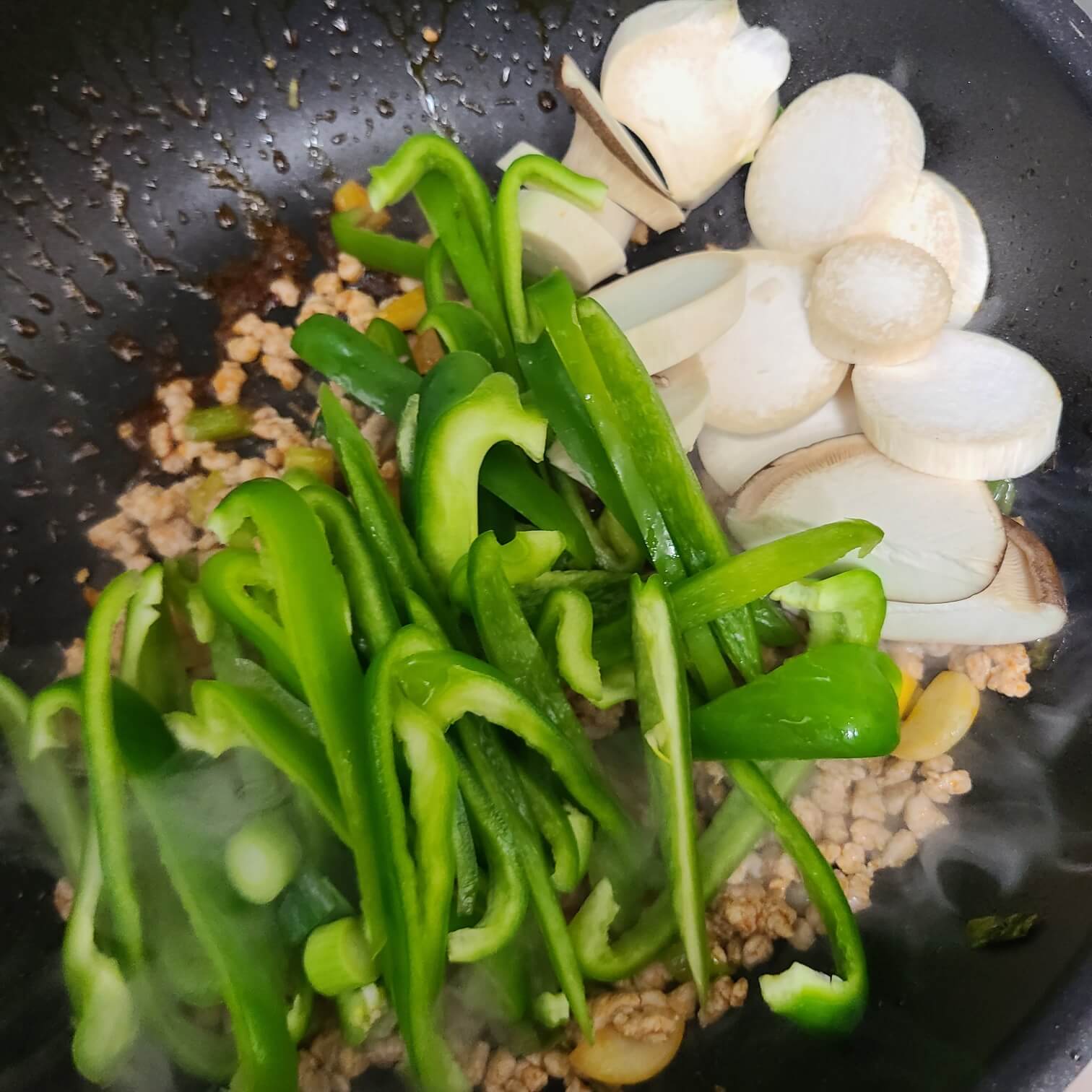 ✅다짐육이 거의 익어서 갈색으로 되었을 때 피망, 새송이 버섯을 넣고 볶아주면된다.