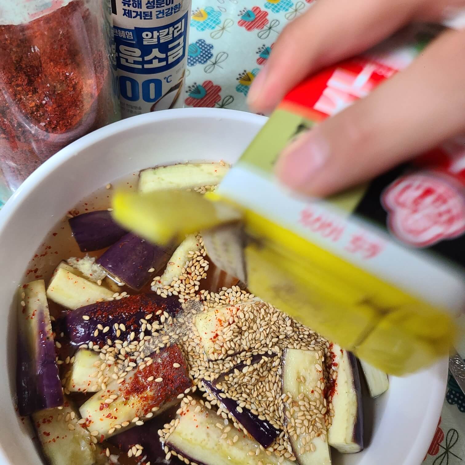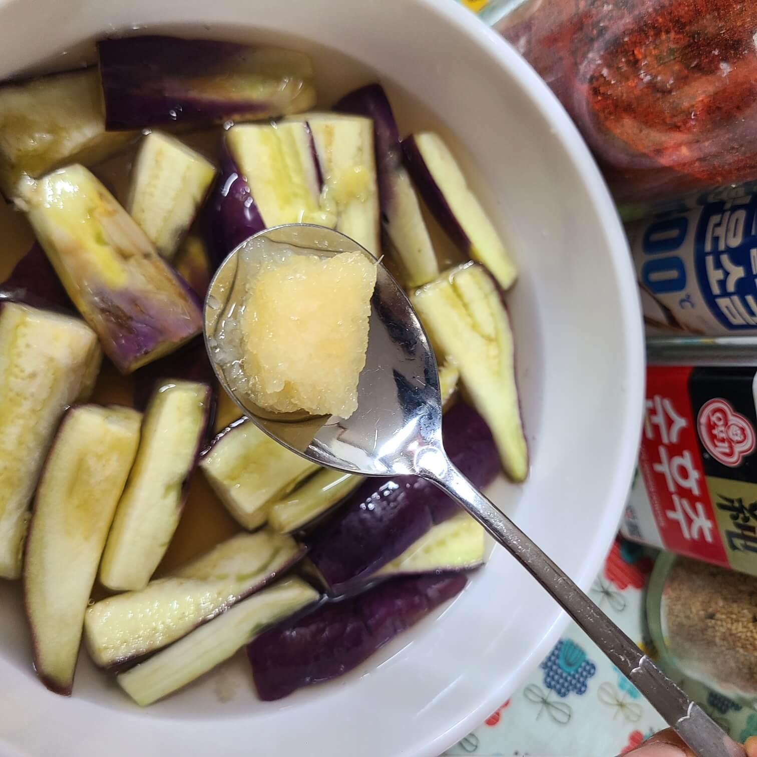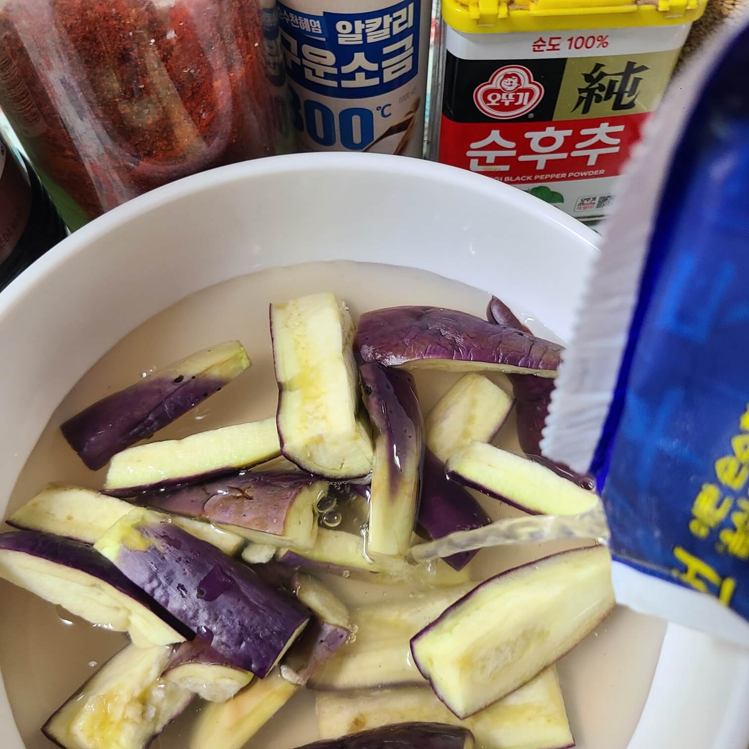 - 가지2개, 국간장, 냉면육수 1팩, 고춧가루, 통깨, 구운소금, 후추, 감식초, 구운소금, 다진마늘