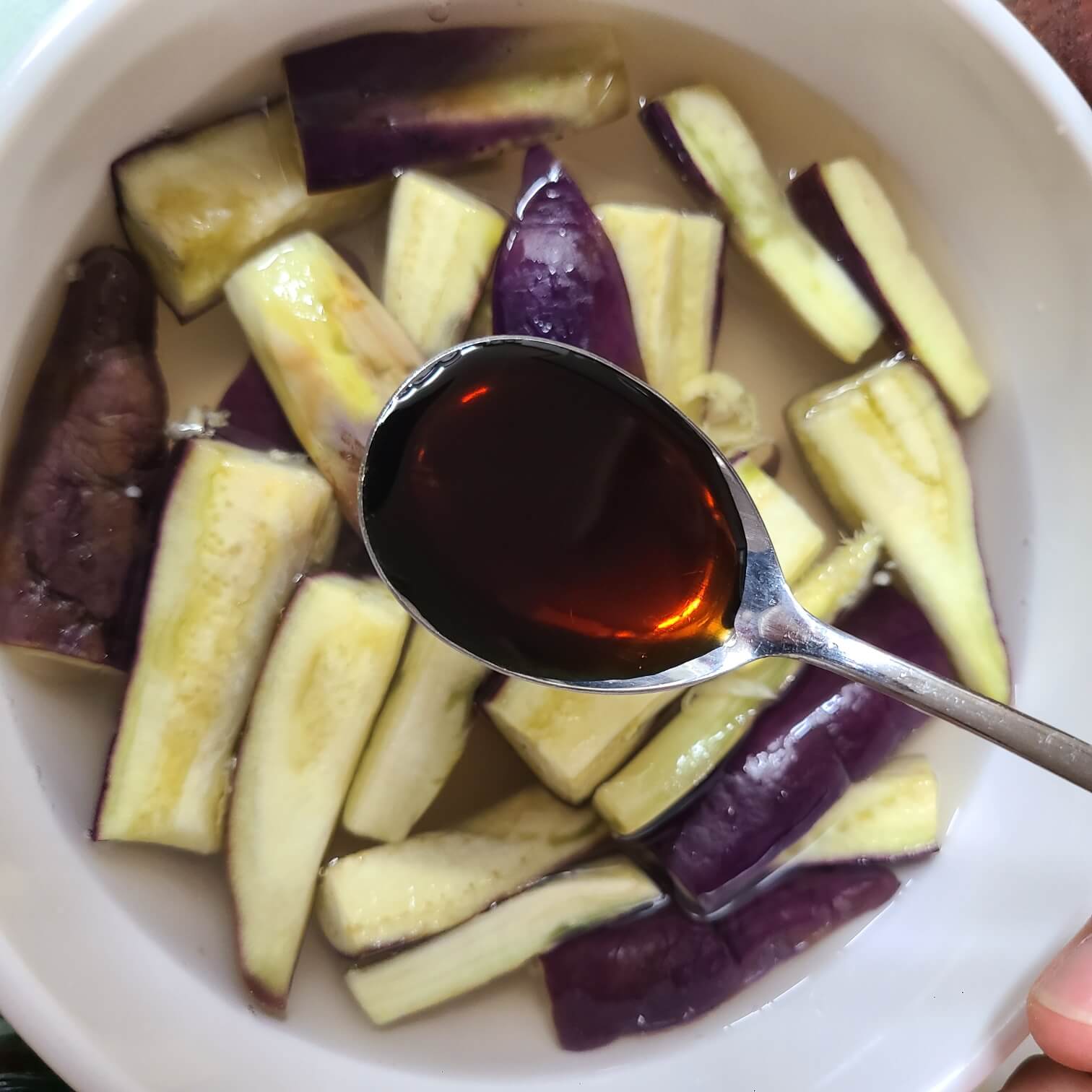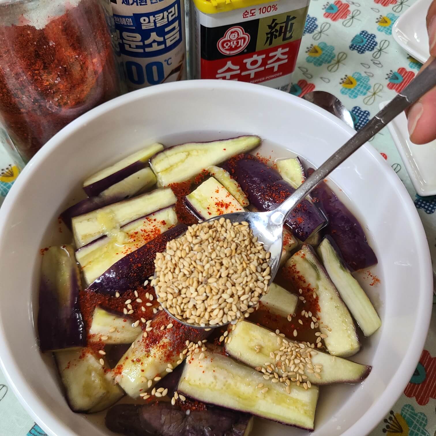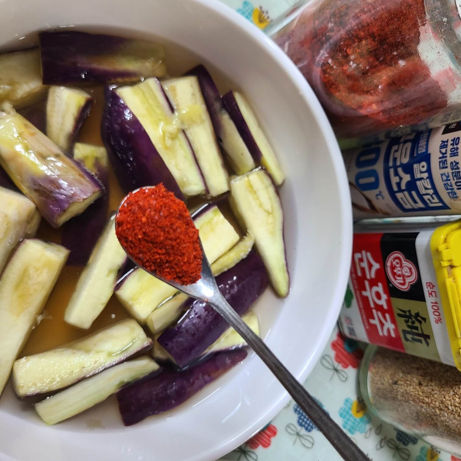 - 가지2개, 국간장, 냉면육수 1팩, 고춧가루, 통깨, 구운소금, 후추, 감식초, 구운소금, 다진마늘