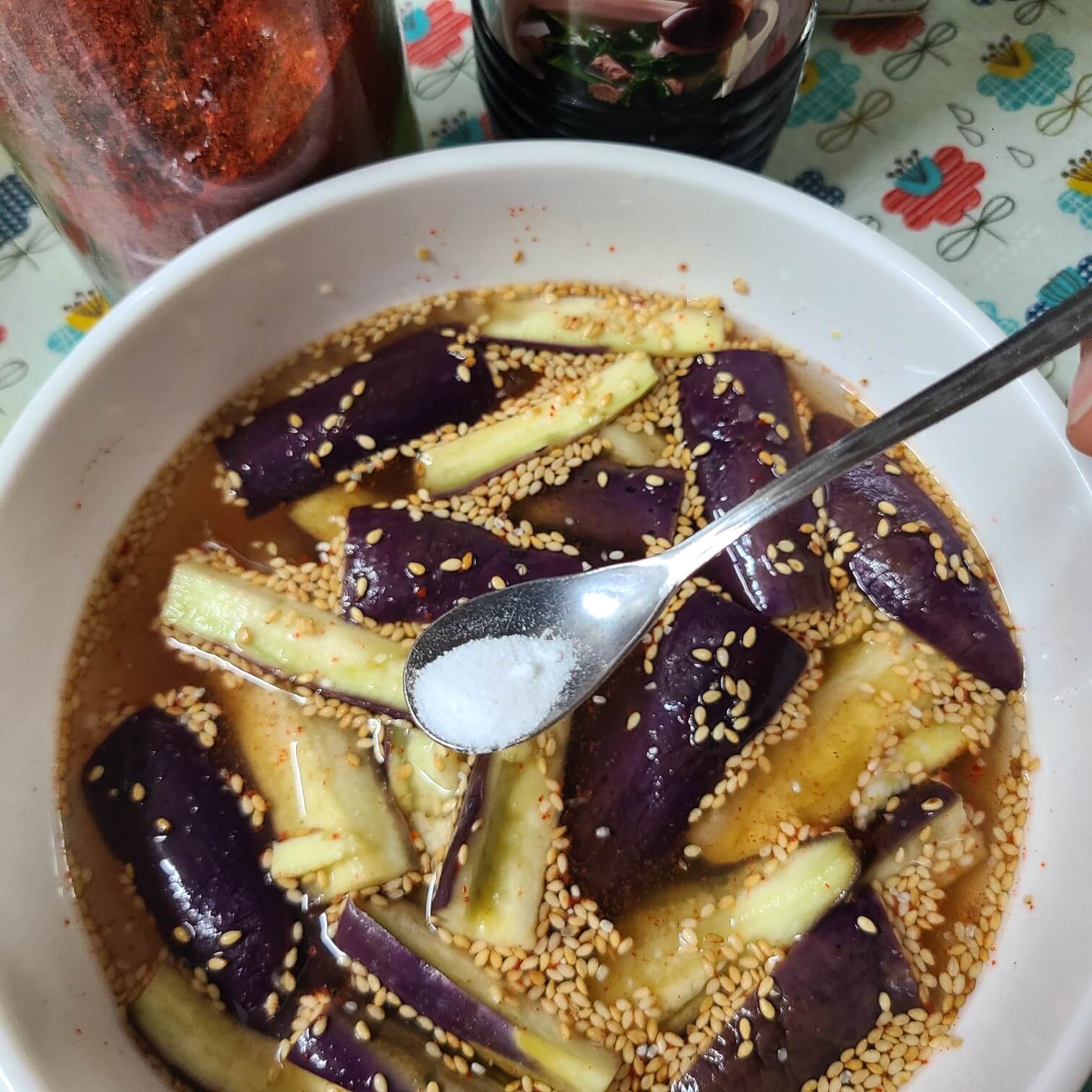 4. 이때 푸추는 취향 것 뿌려주고, 간을 보고 싱거우시면 구운 소금을 티스푼으로 0.5 정도 넣어주면 개인의 취향에 맞게 맛있는 여름 가지냉국을 드실 수 있다.