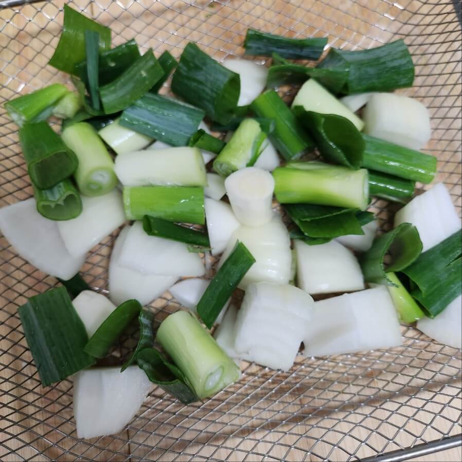 4. 대파와 양파는 먹기 좋게 썰어 주고 1층에는 양파, 대파로 넣고 밑칸에는 대파와 양파를 넣고 윗 칸에는 도래창을 넓게 펴서 올려주면 된다.