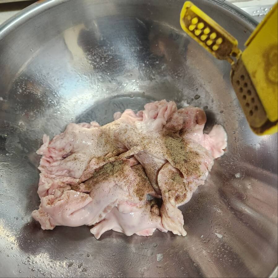 2. 도래창 핏물을 제거하고 흐르는 물에 제거 한 후에 키친타올로 제거한 뒤에 밑간을 해주면 된다.