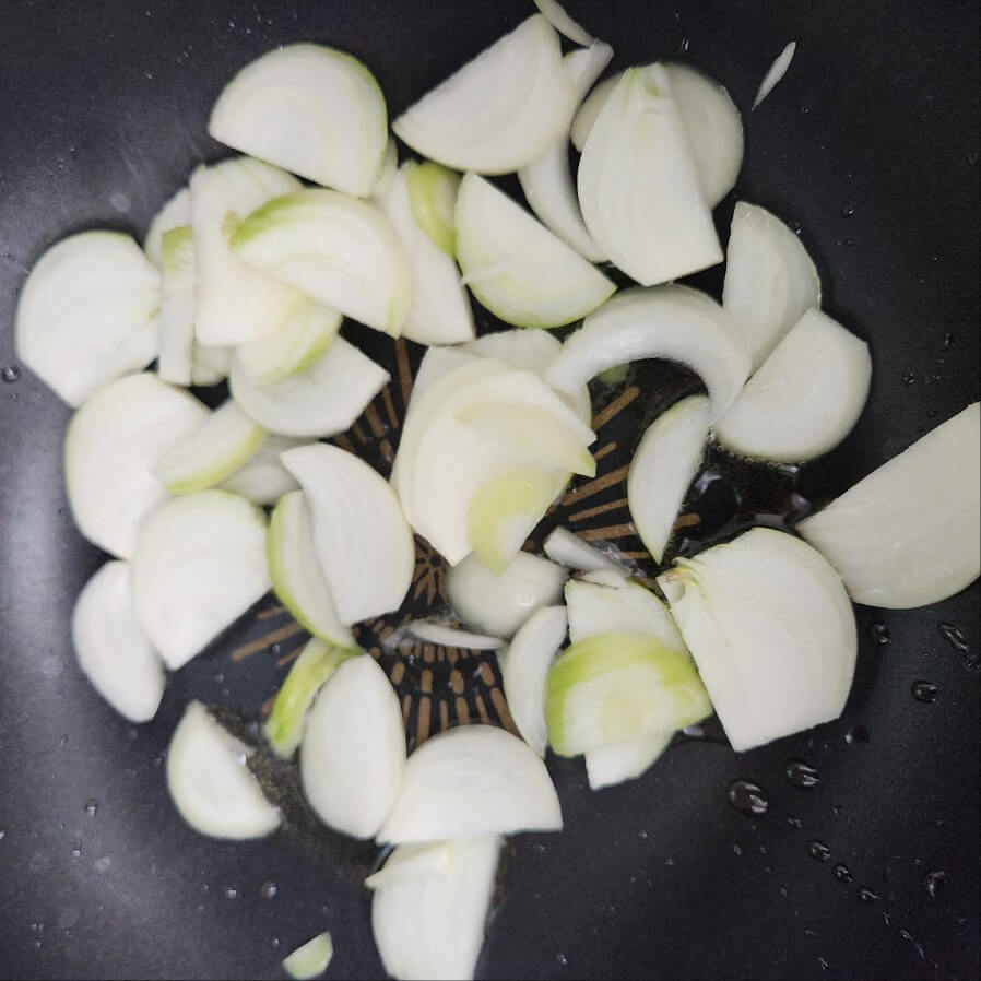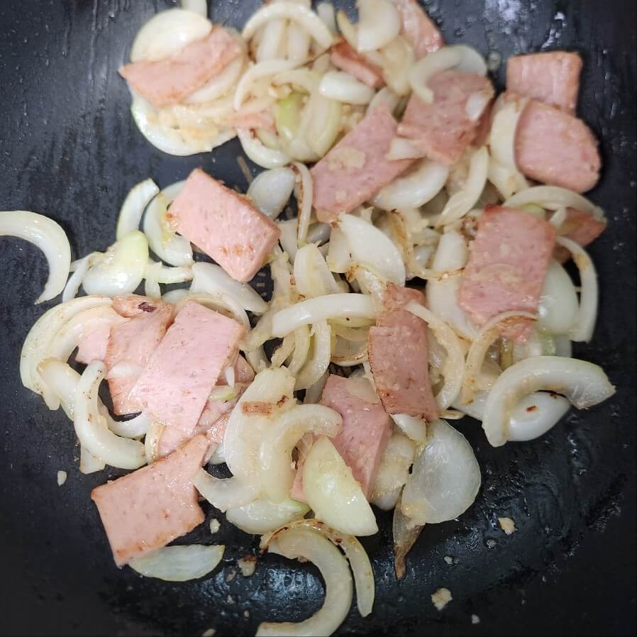 ✅팬에 올리브유 2를 두르고서 양파, 스팸을 중간불로 2분동안 볶아주면 오른쪽 사진처럼 양파 또는 스팸이 갈색으로 변하기 시작한다.
