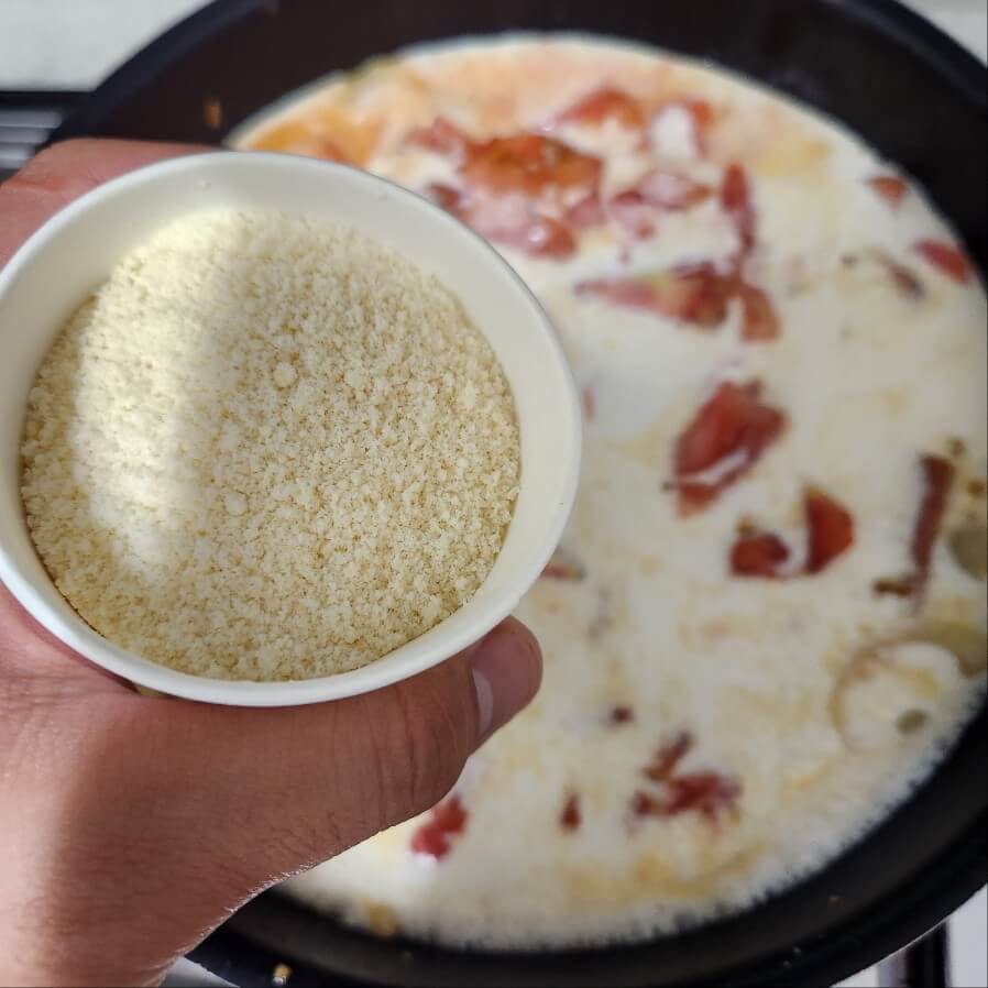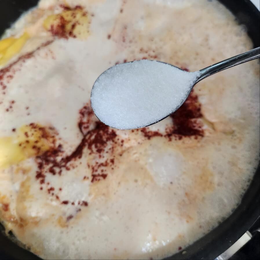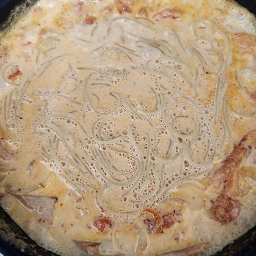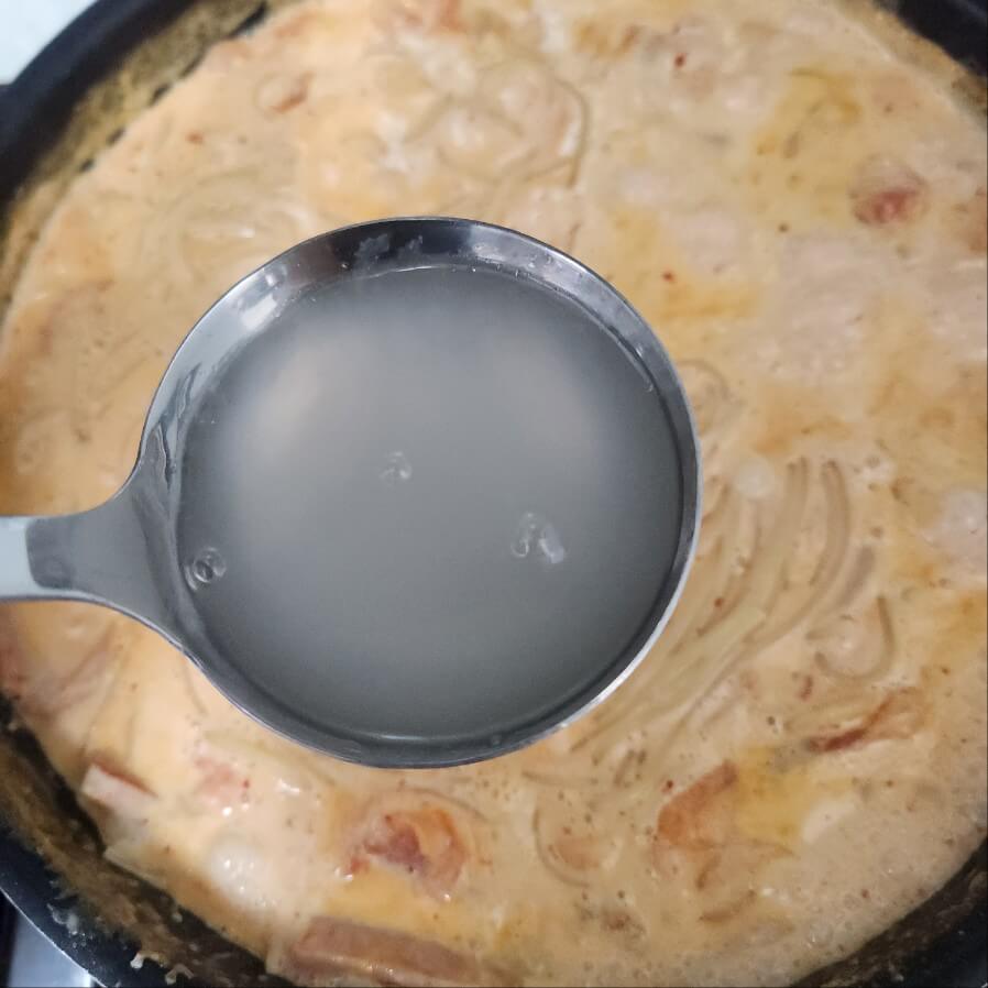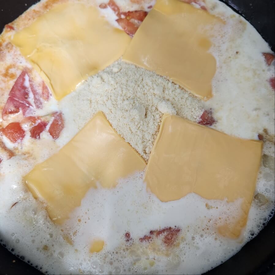 6. 숟가락 기준으로 고추장 1, 고춧가루 1, 설탕 1, 종이컵 기준으로 우유 4잔, 휘핑크림 1.5잔, 파마산 치즈가루 1잔, 체다치즈 4장을 넣고 중간불 또는 센불로 15분간 끓여주면 된다.