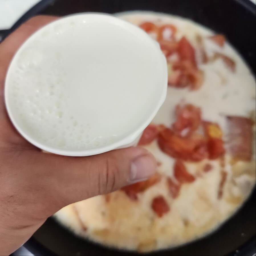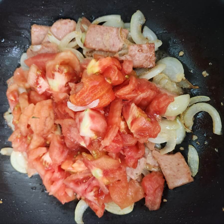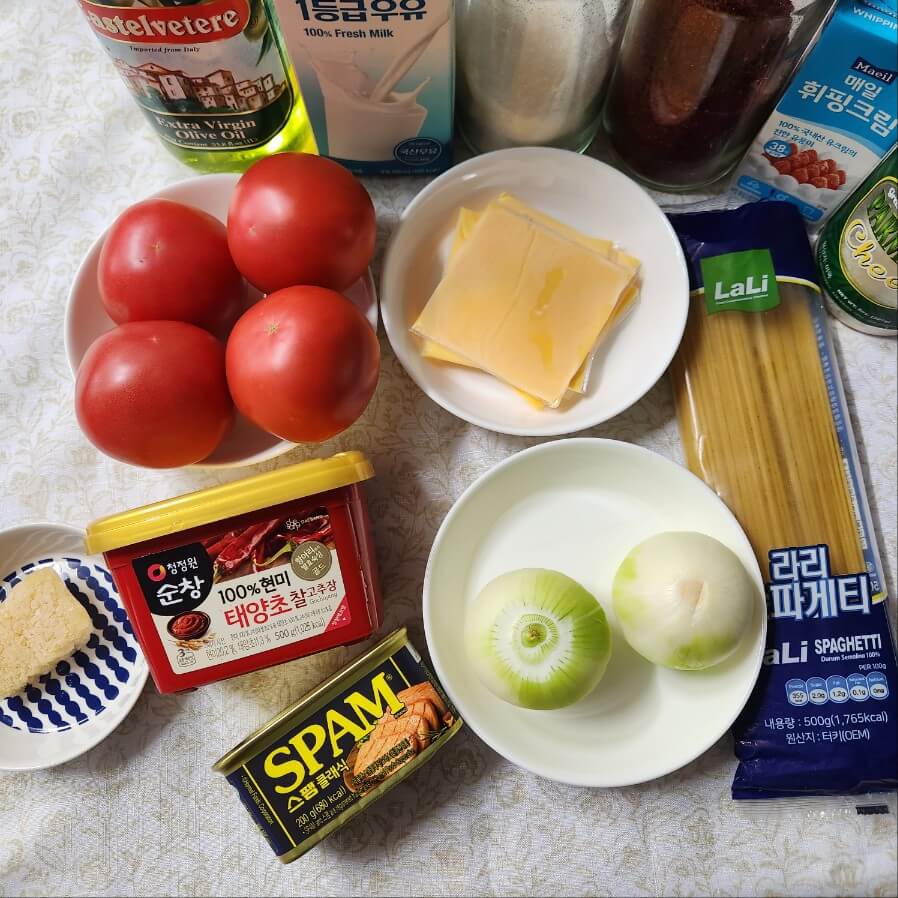 - 올리브유, 양파, 스팸, 다진마늘, 우유, 휘핑크림, 파마산 치즈 가루, 고추장, 고춧가루, 설탕, 천일염, 스파게티, 토마토 4개, 양파 2개, 스팸 반개