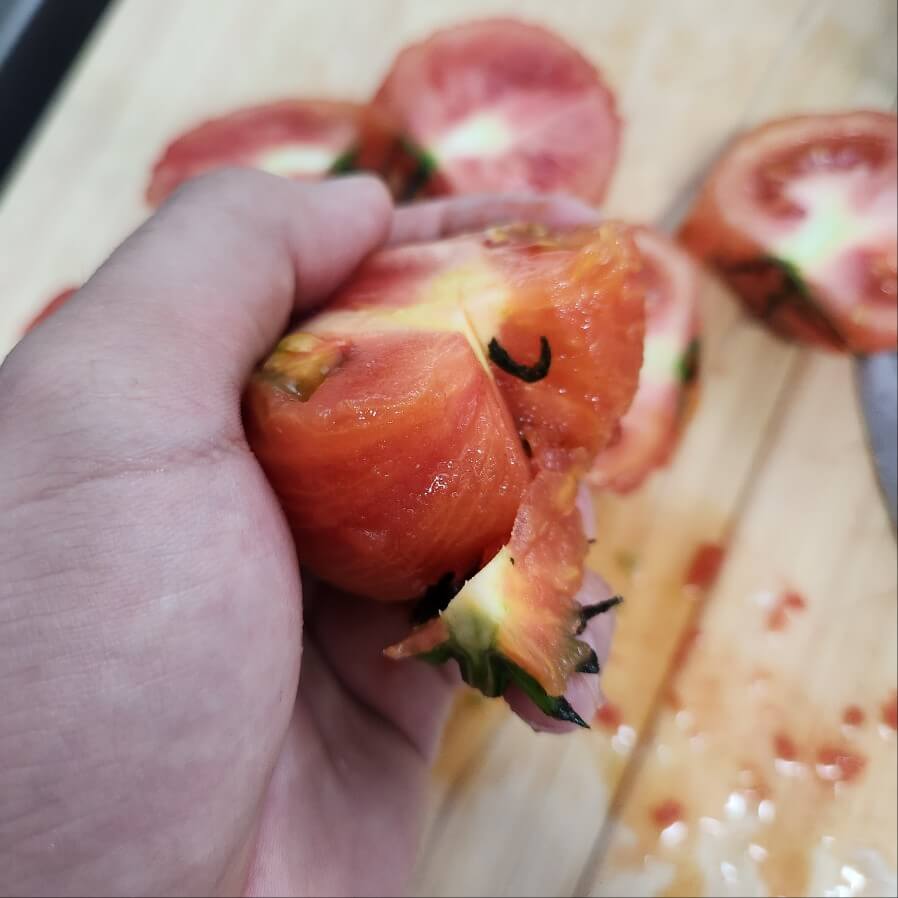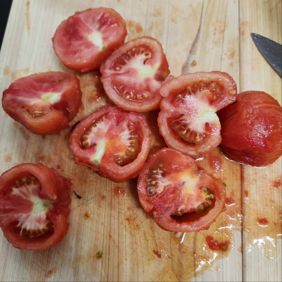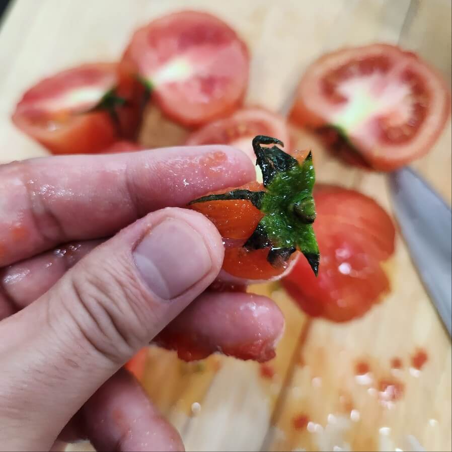 4. 토마토 껍질을 모두 벗기고, 꼭지부분은 "v" 자로 칼집은 낸뒤에 토마토와 꼭지를 분리해주면 된다.