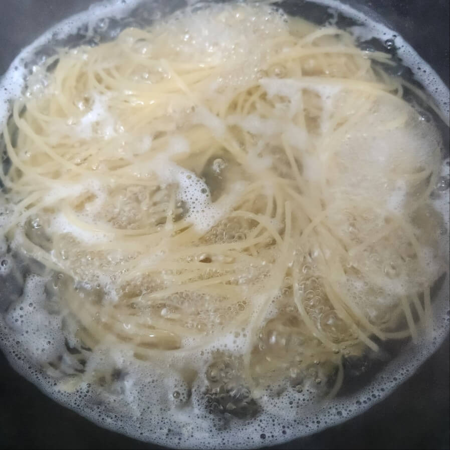 7. 스파게티 면은 제조사마다 뒷면에 끓는 시간이 표기 되어 있지만 보편적으로 10분 정도 삶아주면 알맞은 스파게티 식감이 되는 것 같다.