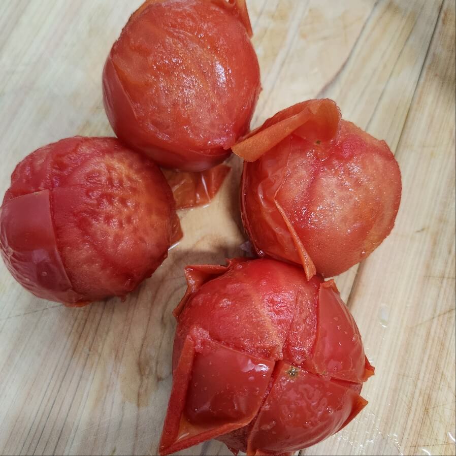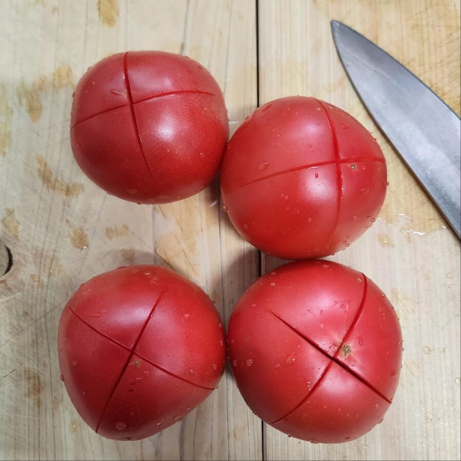 ✅ 토마토 뒷 부분을 칼집을 낸뒤 끓는 물에 데쳐주면된다.