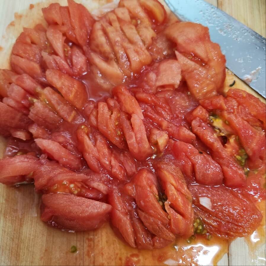 5. 이제 손질한 토마토를 모두 다져 준 상태에서 야채를 볶은 곳에서 센불로 볶아주기를 해주면 된다.