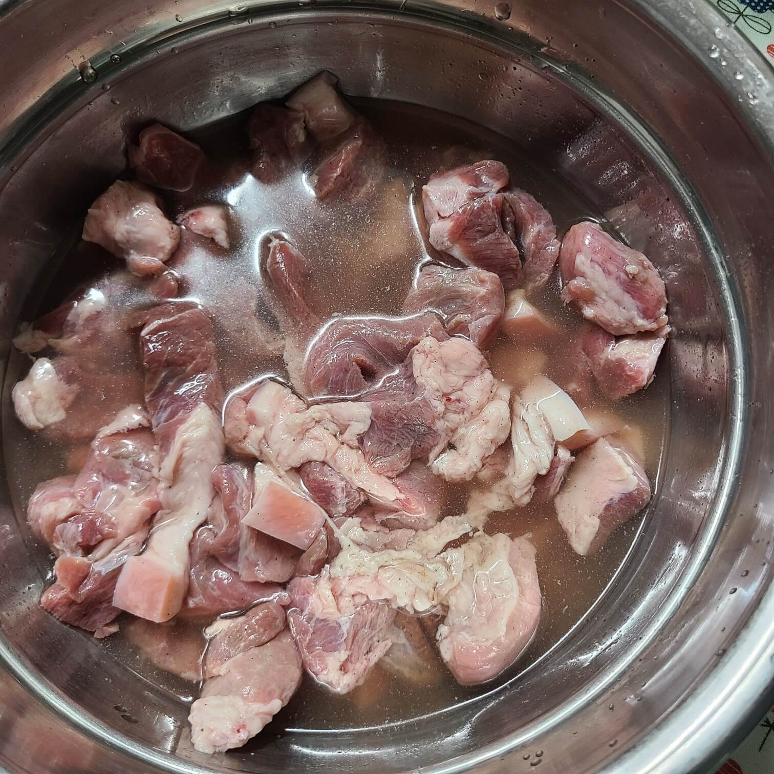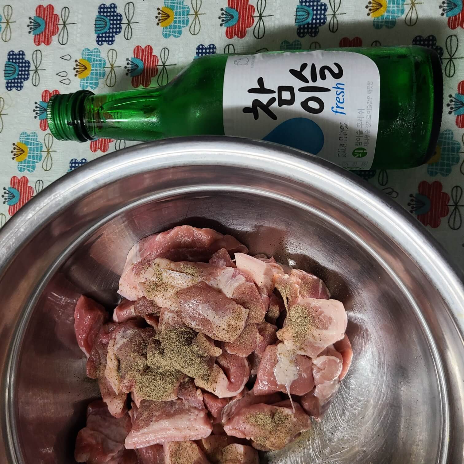 1. 돼지고기가 냄새가 날 수 있기 때문에 후추를 취향 것 또는 3번 털고, 소주 300ml를 넣고 돼지고기를 숙성해주면 된다.