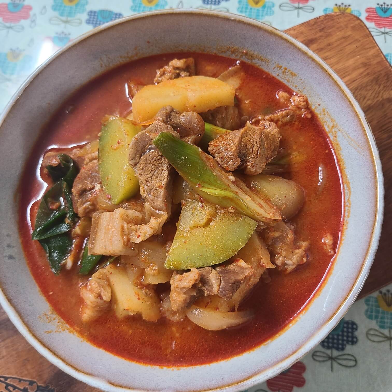 - 돼지고기 578g, 양파 165g, 감자 237g, 호박 340g, 다진마늘 38g. 대파 63g, 청양고추 12g