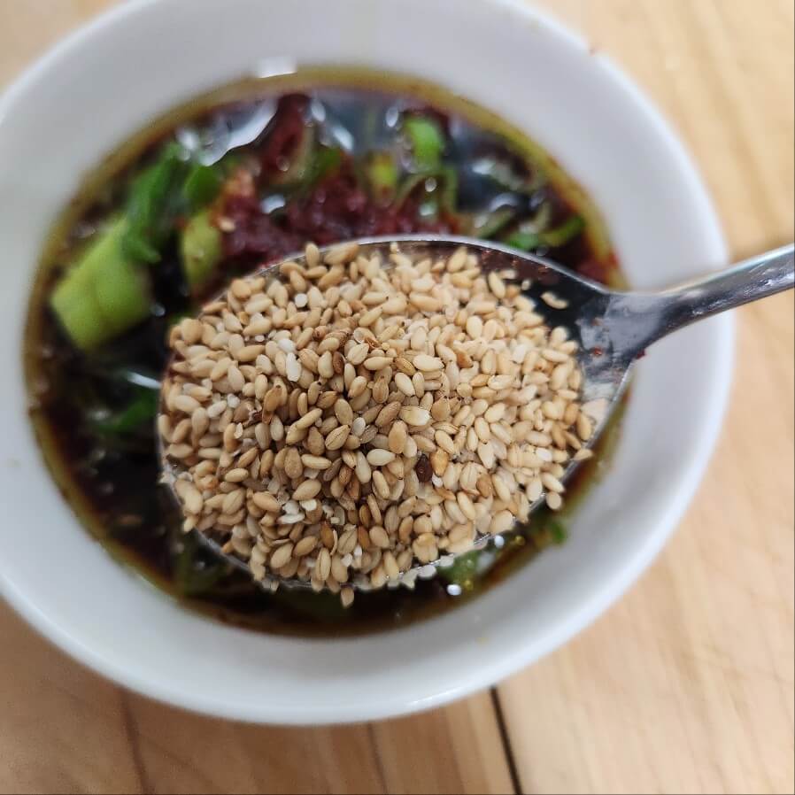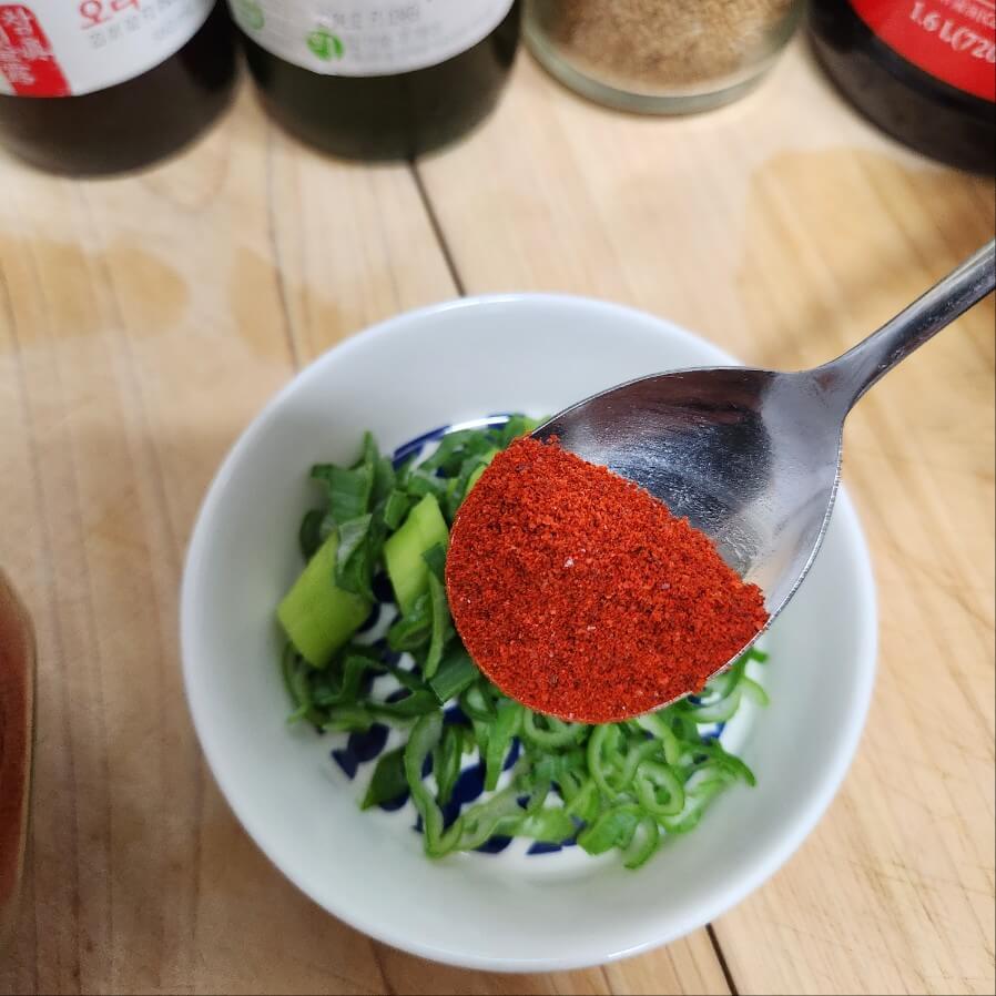 ✅숟가락 기준으로 간장 5, 참기름 1, 들기름 1, 고춧가루 0.5, 통깨 1을 넣고 잘 섞어주면 된다.