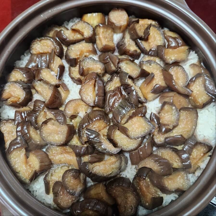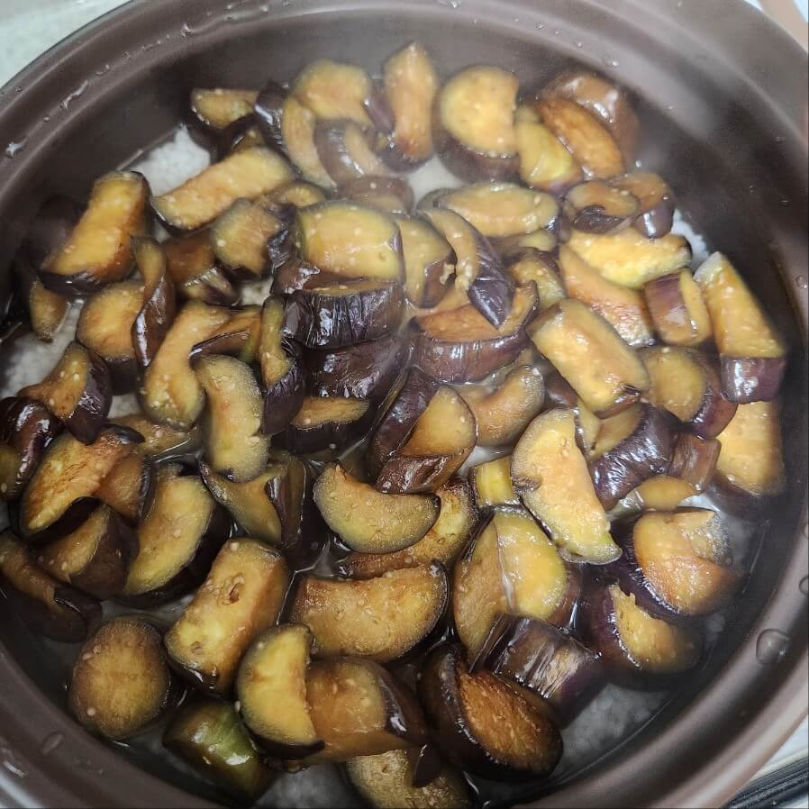 ✅위 사진을 보면 쌀알 바로위에 물이 족므 채워져 있고, 이제 볶은 가지를 넣고 솥밥을 시작하면 된다.