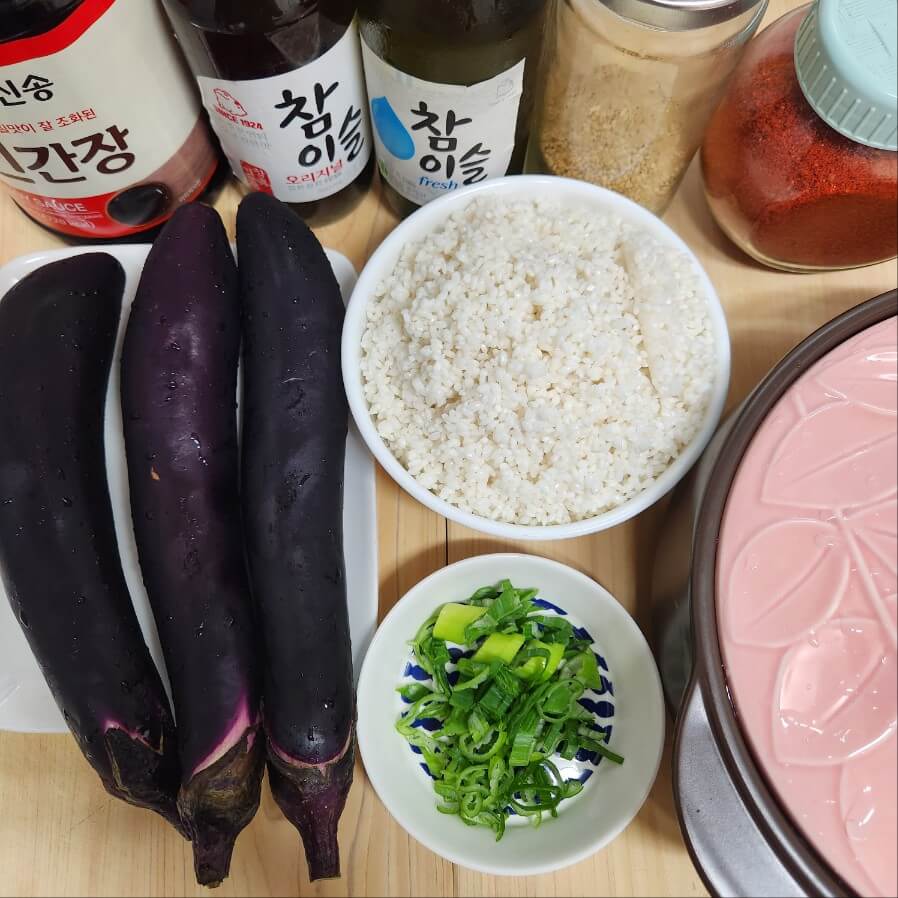- 가지3개, 쌀 한공기, 송송 썰은 대파 조금, 간장, 들기름, 참기름, 통깨, 고춧가루, 냄비솥