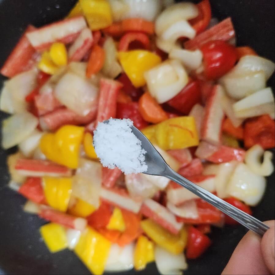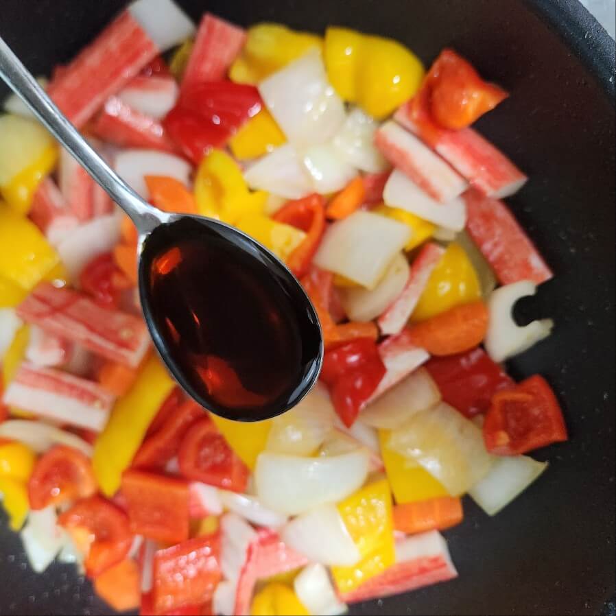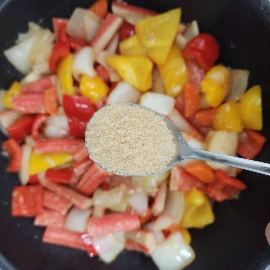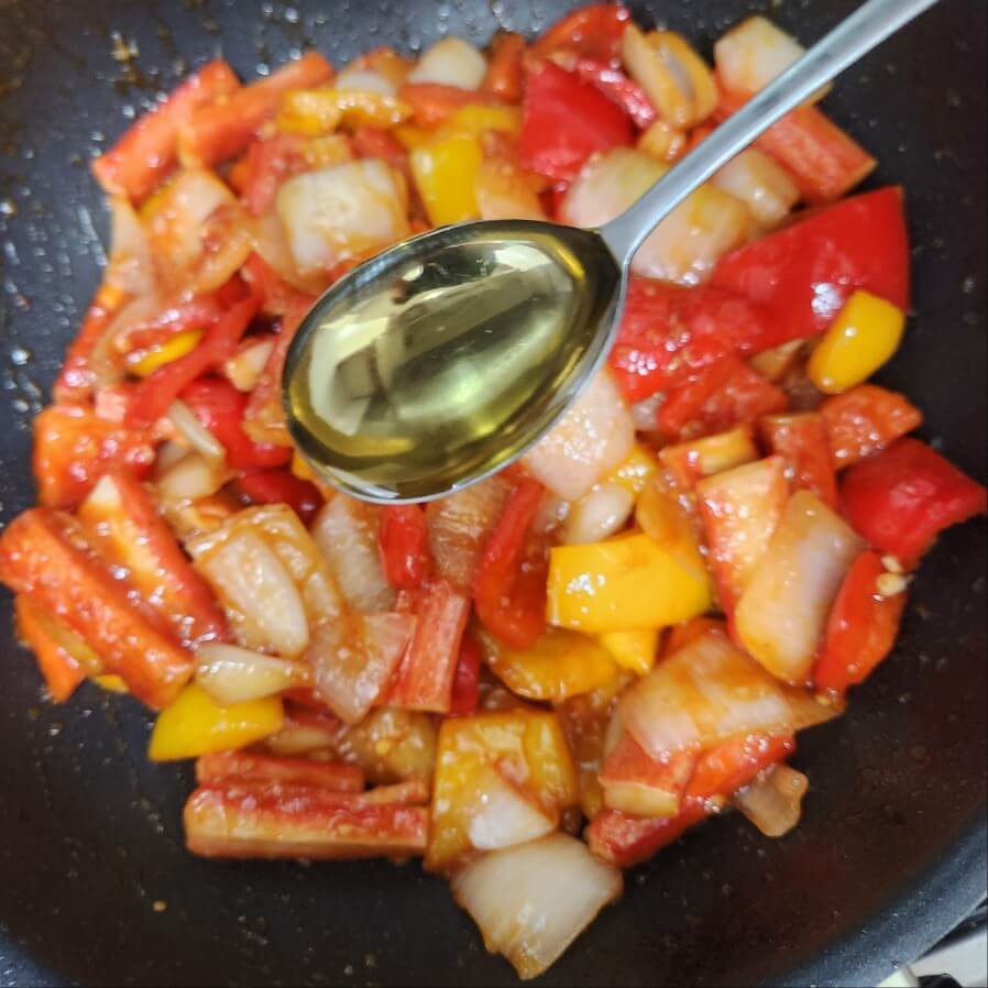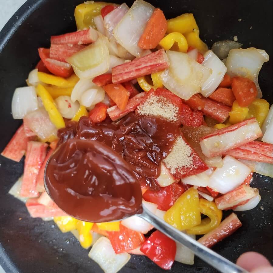 4. 오양맛살 하인즈 케찹 야채 볶음 만들 때 양념은 숟가락 기준으로 간장1, 설탕 2, 케찹 7, 티스푼 기준으로 꽃수금 0.5 를 넣고 1분동안 볶아주면 된다.