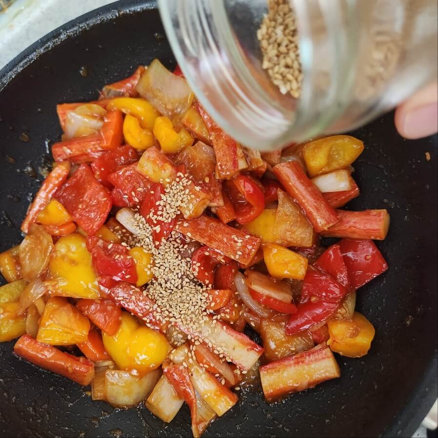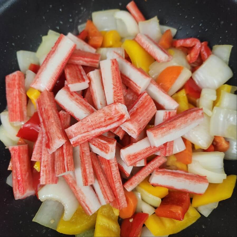 - 오양맛살 1팩, 빨강 파프리카 1개, 노랑 파프리카 1개, 양파 1개, 다진마늘, 당근반개, 진간장, 올리고당, 하인즈케찹, 꽃소금, 통깨, 올리브유