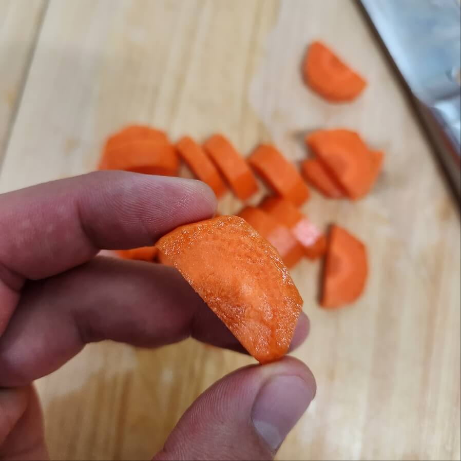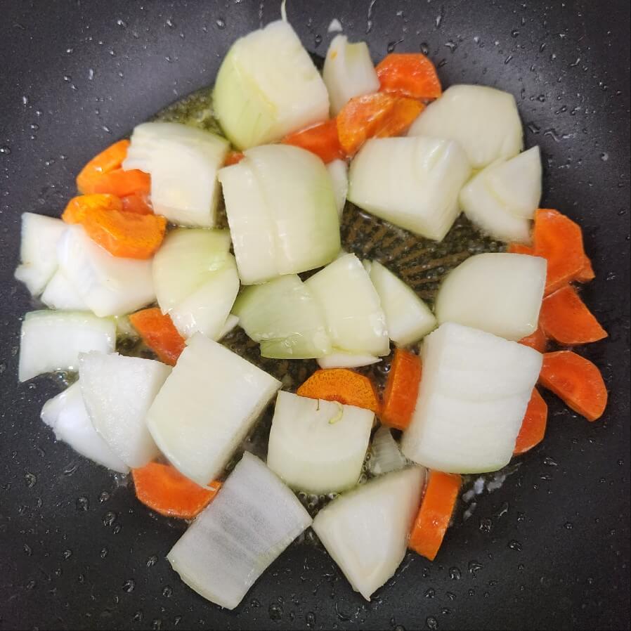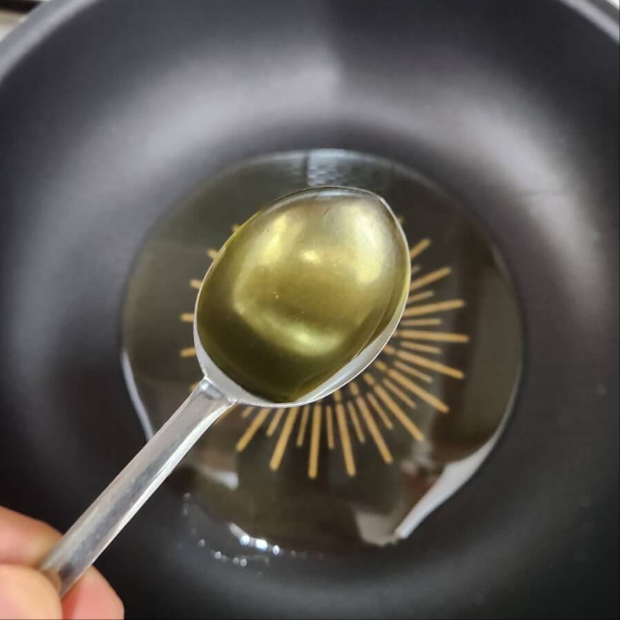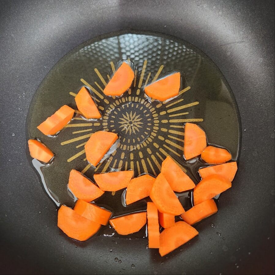 ✅숟가락 기준으로 식용류 5를 넣고 손질한 당근을 볶아주면 되는데, 당근 표면이 변하기 시작하면 다음 야채를 볶아주면 된다.