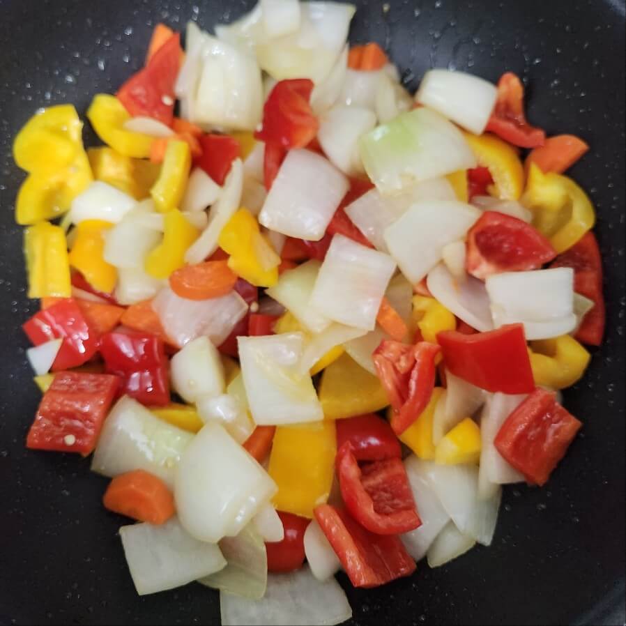 3. 1분뒤에 양파 넣고 센불 1분, 파프리카 넣고 센불 1분씩 볶아주면 된다.