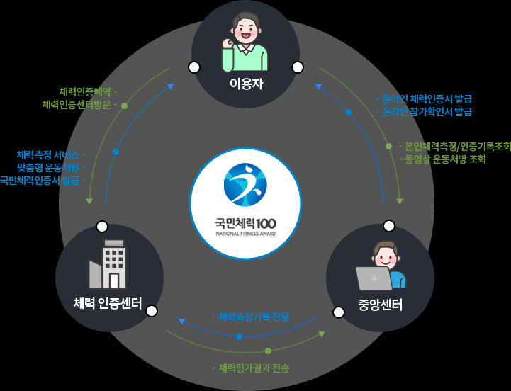 국민 체력 100을 체계적으로 관리하고 체력 수준에 따라 관리하고, "국민체력100 체력인증센터 및지정스포츠시설에서 스포츠활동 참여 확인" 하면 스포츠활동 인센티브도 받을 수 있습니다.