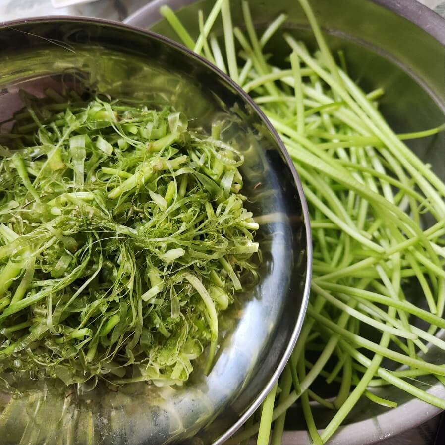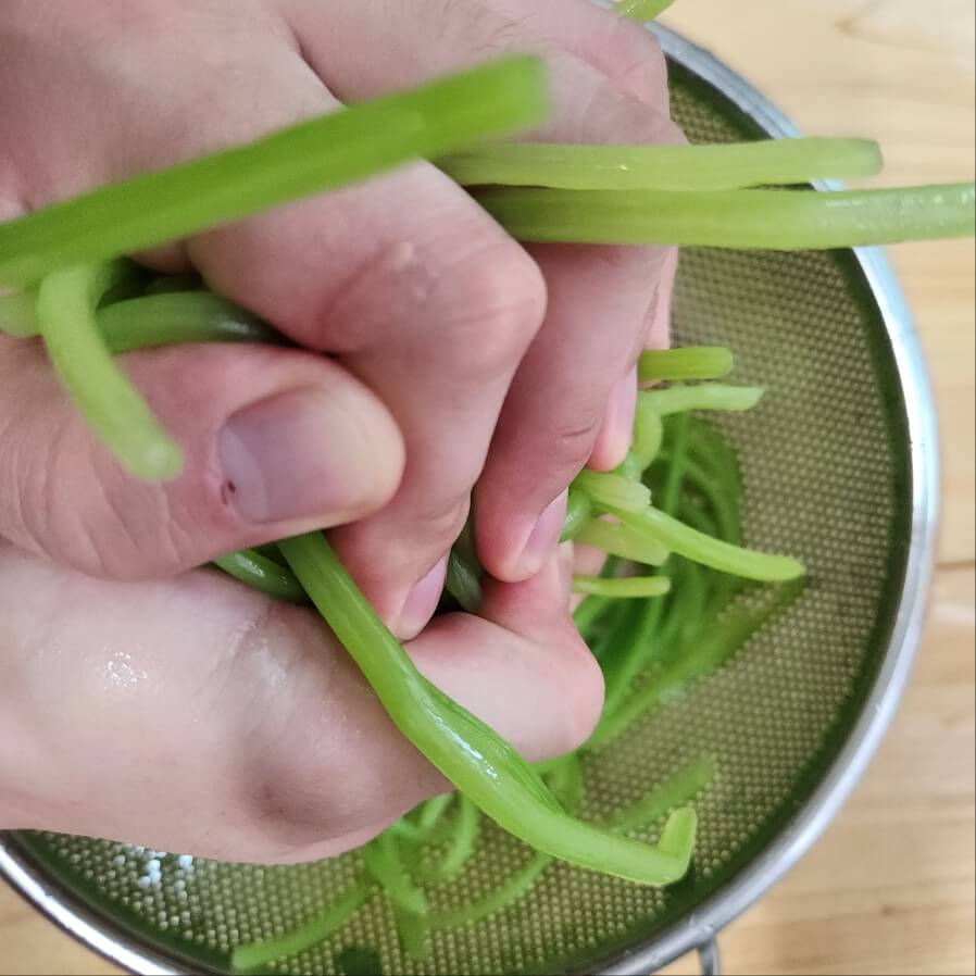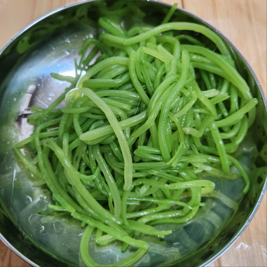 ✅숟가락 기준으로 천일염 1을 넣고, 고구마 줄기를 삶고나서 찬물로 씻어주면 된다.