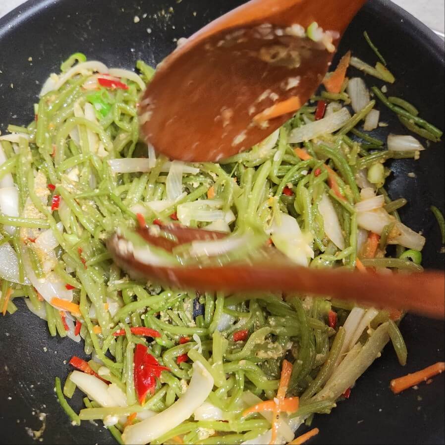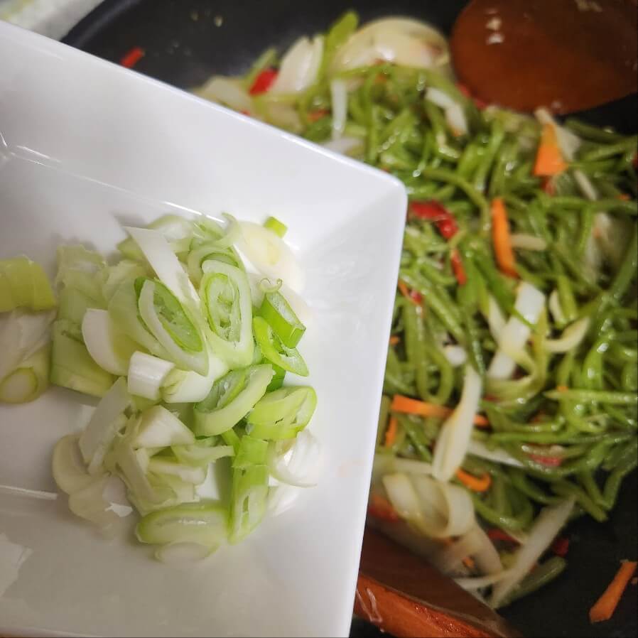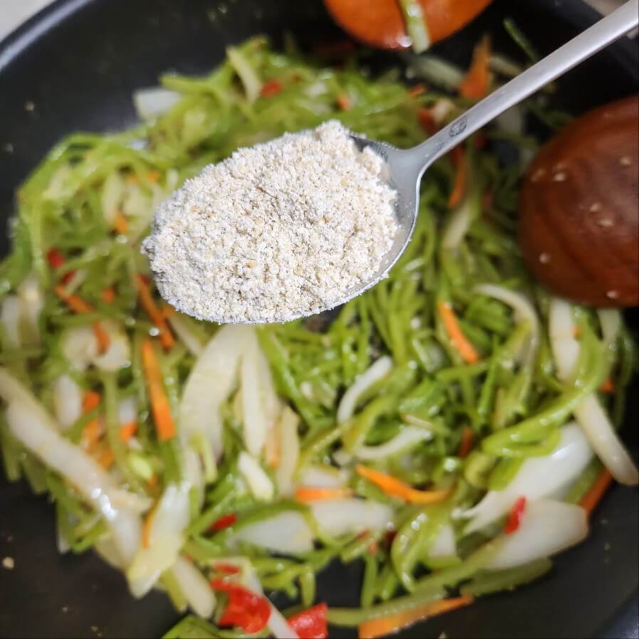 4. 당개, 대파 를 넣고, 숟가락 기준으로 들깨가루 2를 넣고 마무리로 볶아주면 맛있는 들깨 고구마줄기 볶음을 먹을 수 있다.