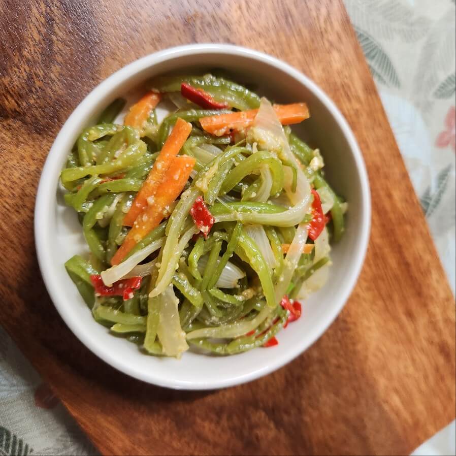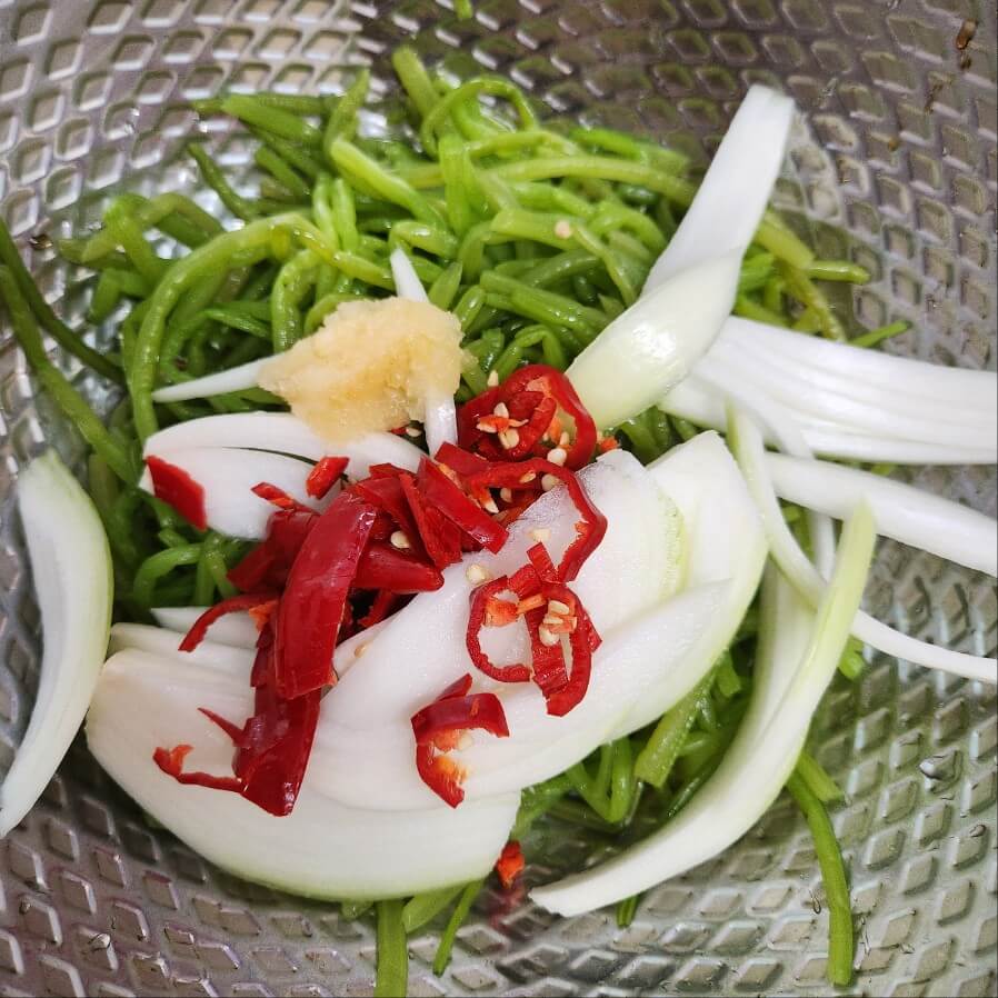 - 양파 163g, 당근 17g, 홍고추 18g, 다진마늘 10g, 고구마 줄기 418g