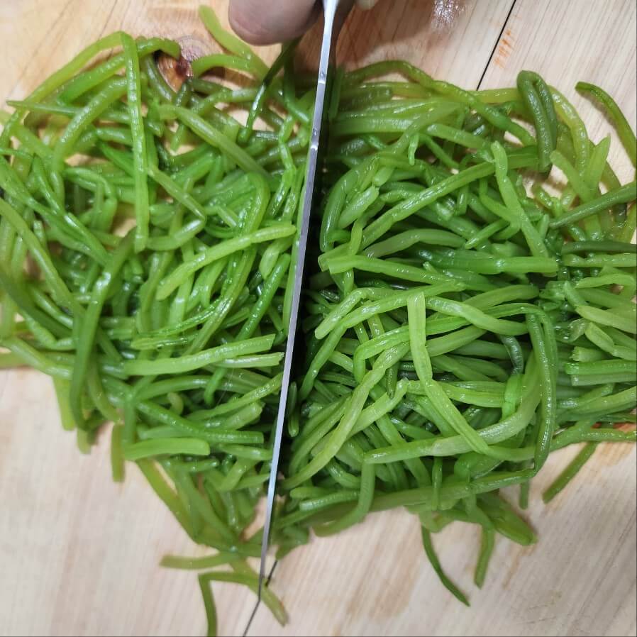 2. 손질 한 고구마 줄기는 길기 때문에 먹기좋은 크기로 칼로 반, 또는 3등분으로 잘라주면 된다.