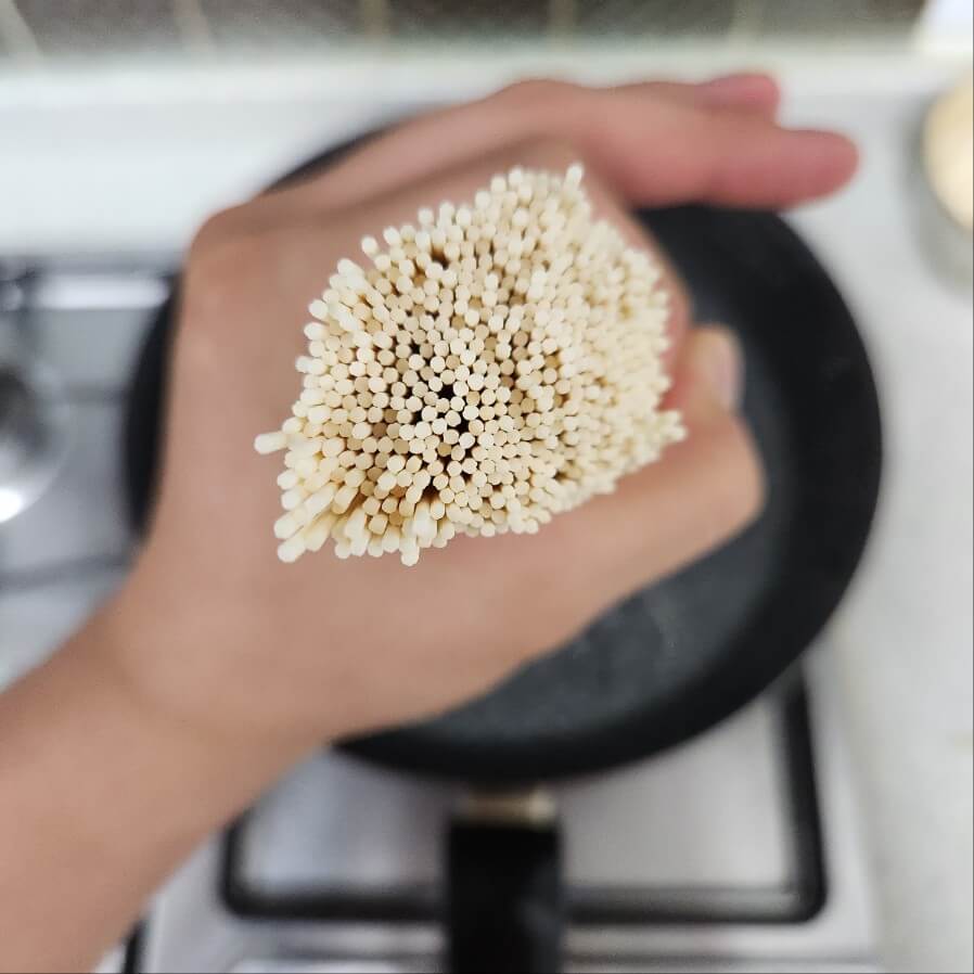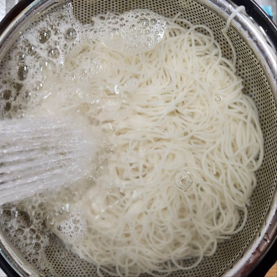 ✅물이 끓으면 찬물을 넣고를 반복하면 더 쫄깃한 면을 얻을 수 있고, 찬물로 2번정도 헹궈주면 된다.