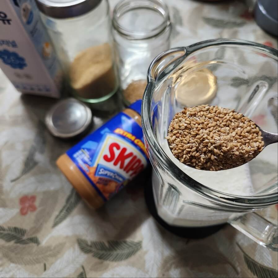 2. 이제 블라이더에 종이컵 기준으로 우유 3잔, 숟가락 기준으로 통깨 1 , 설탕 1 , 땅콩잼 1, 티스푼기준으로 꽃고금 0.5를 넣고 곱게 갈아주면 된다.