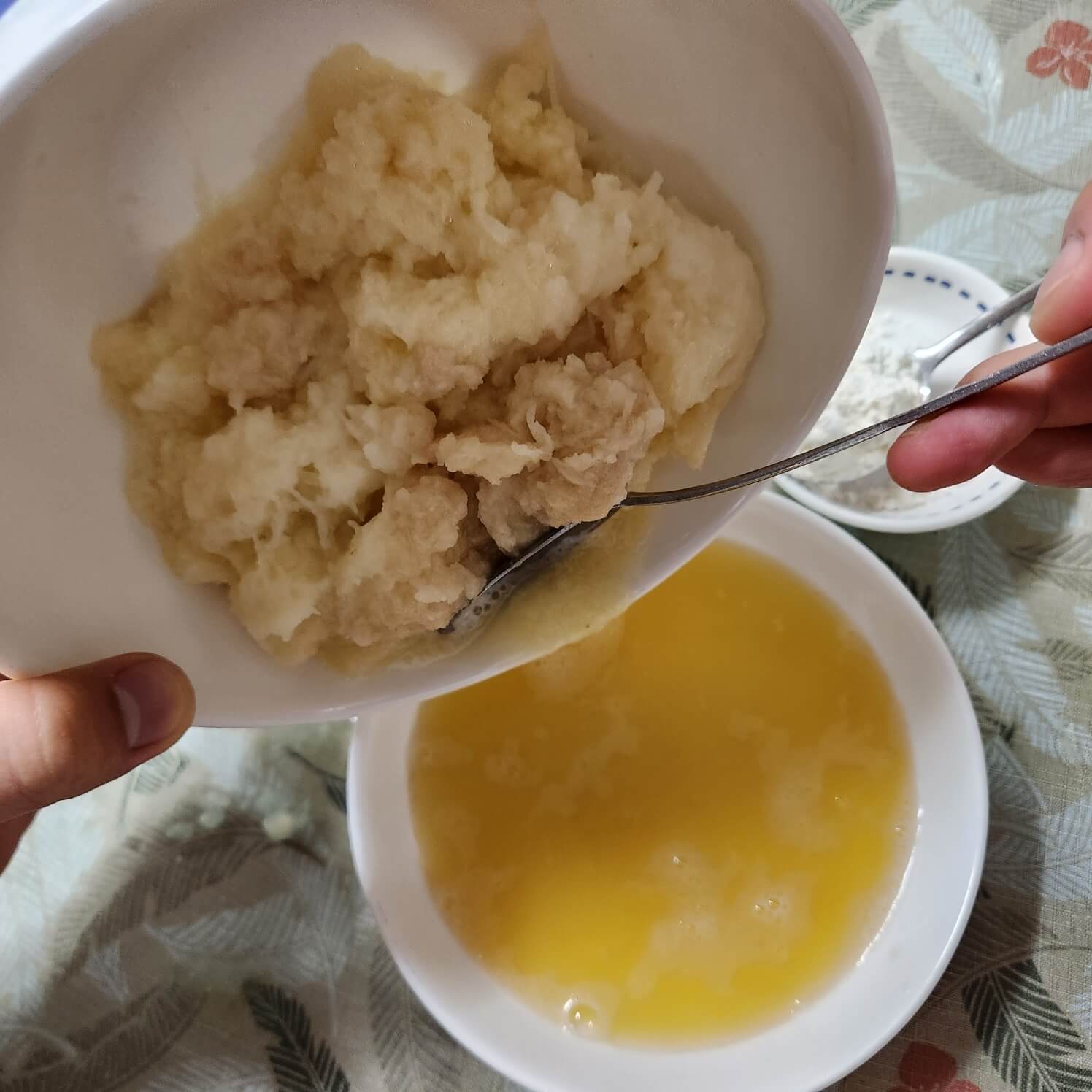 ✅이때 믹서기로 하는 것 보다 강판으로 하는것이 물이 덜 빠지고 감자전 만들 때 더 쫄깃하다.